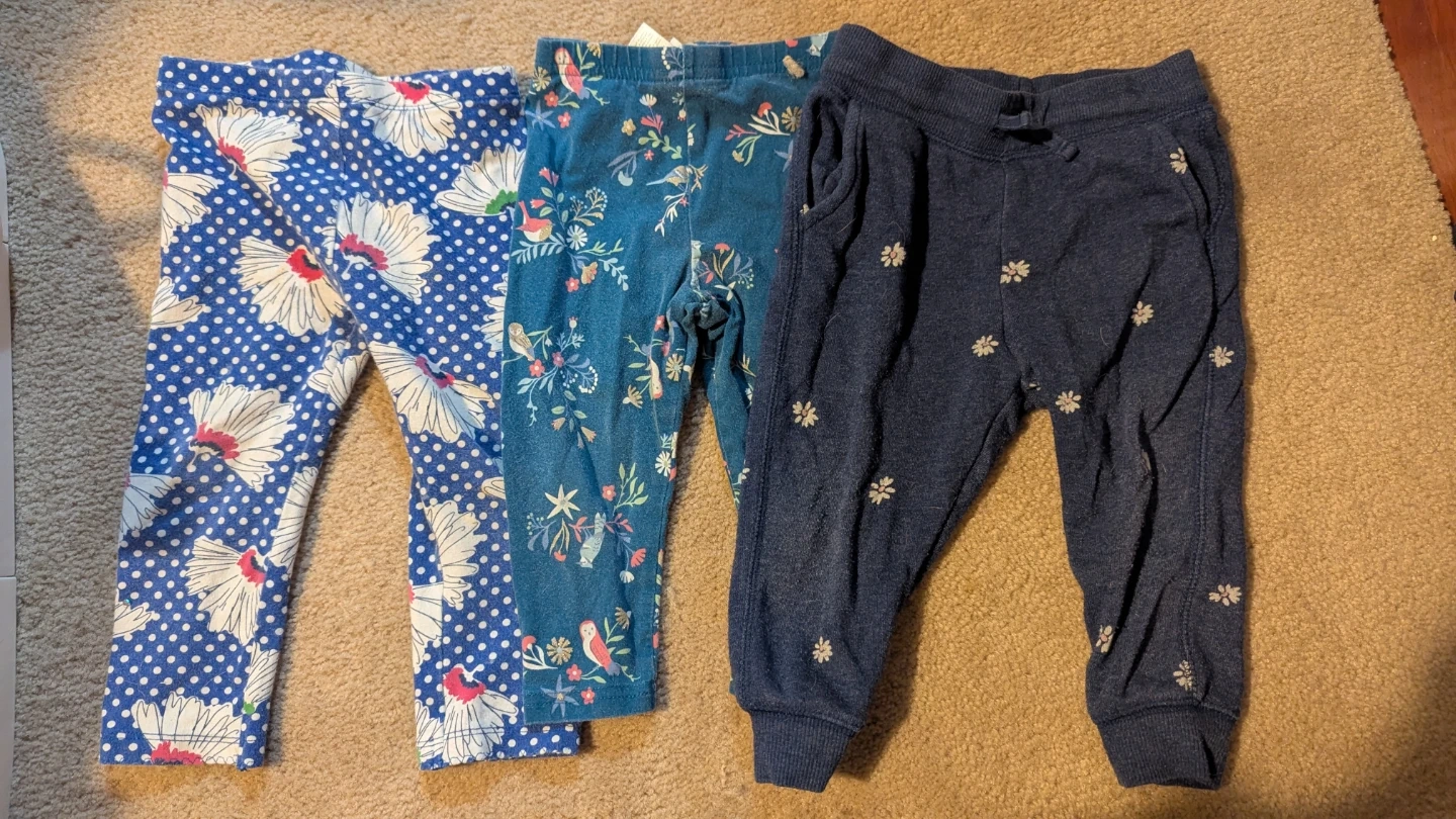 Three pairs of baby girls' pants. Includes one pair of tights with a blue and white polka dot floral pattern, one pair of tights with a teal floral and bird pattern, and one pair of dark navy joggers with small white flowers. Pants are made of soft material for comfort. All 3 for $5. Size 18 months