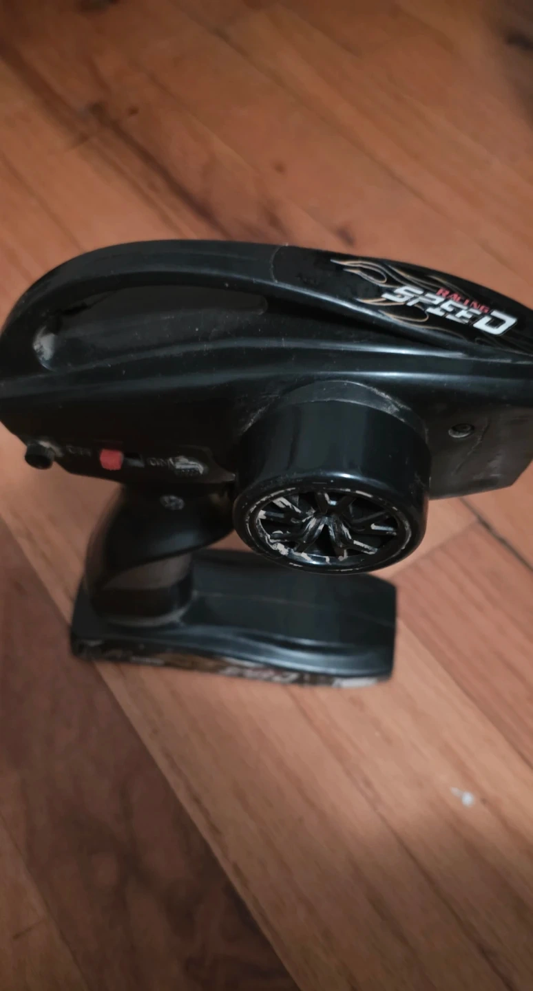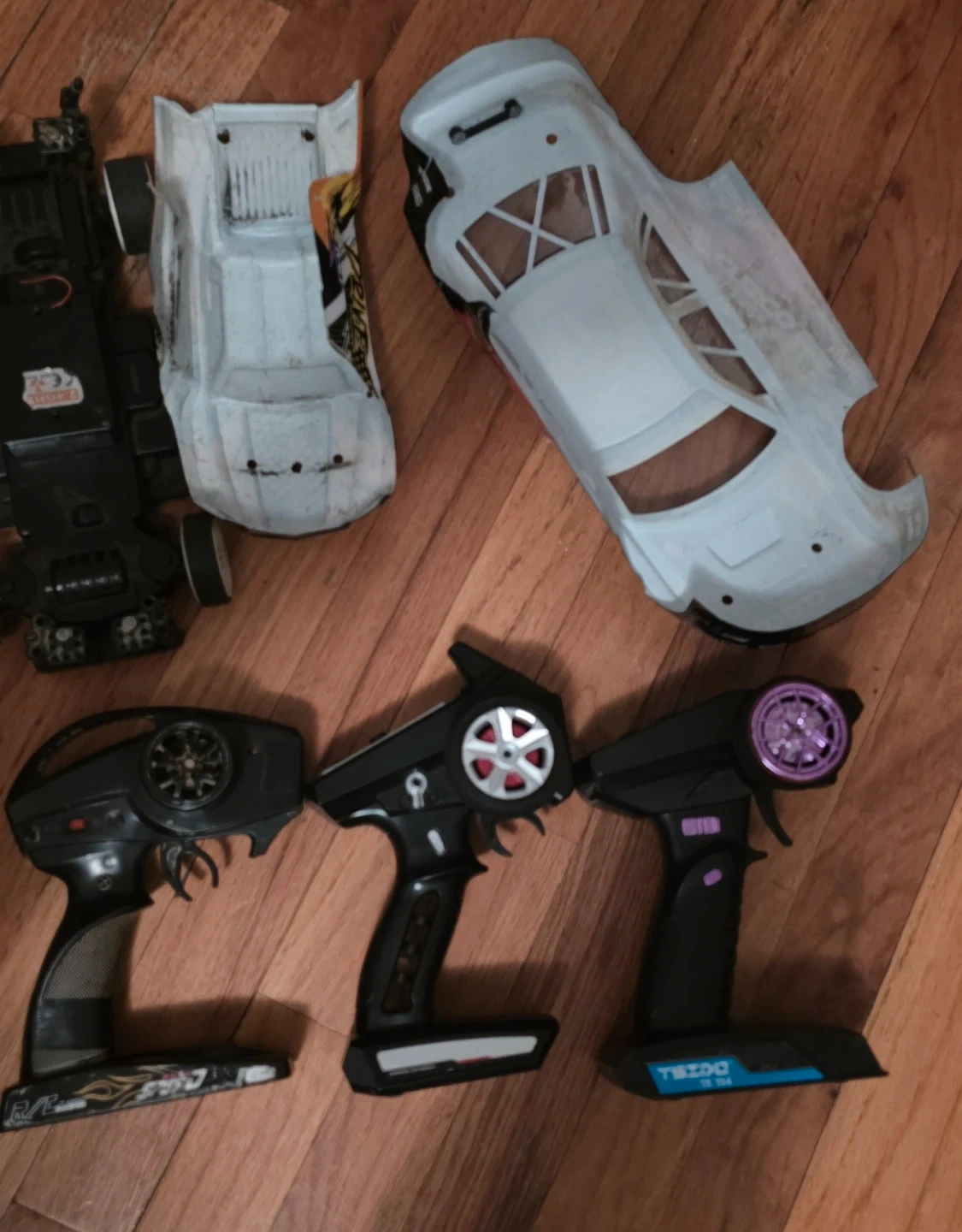 This lot includes two RC car bodies and a chassis with three remote controllers. One body is a Subaru Super GT and the other has a flame design. The controllers are from brands like TSISDO and RC. Parts only