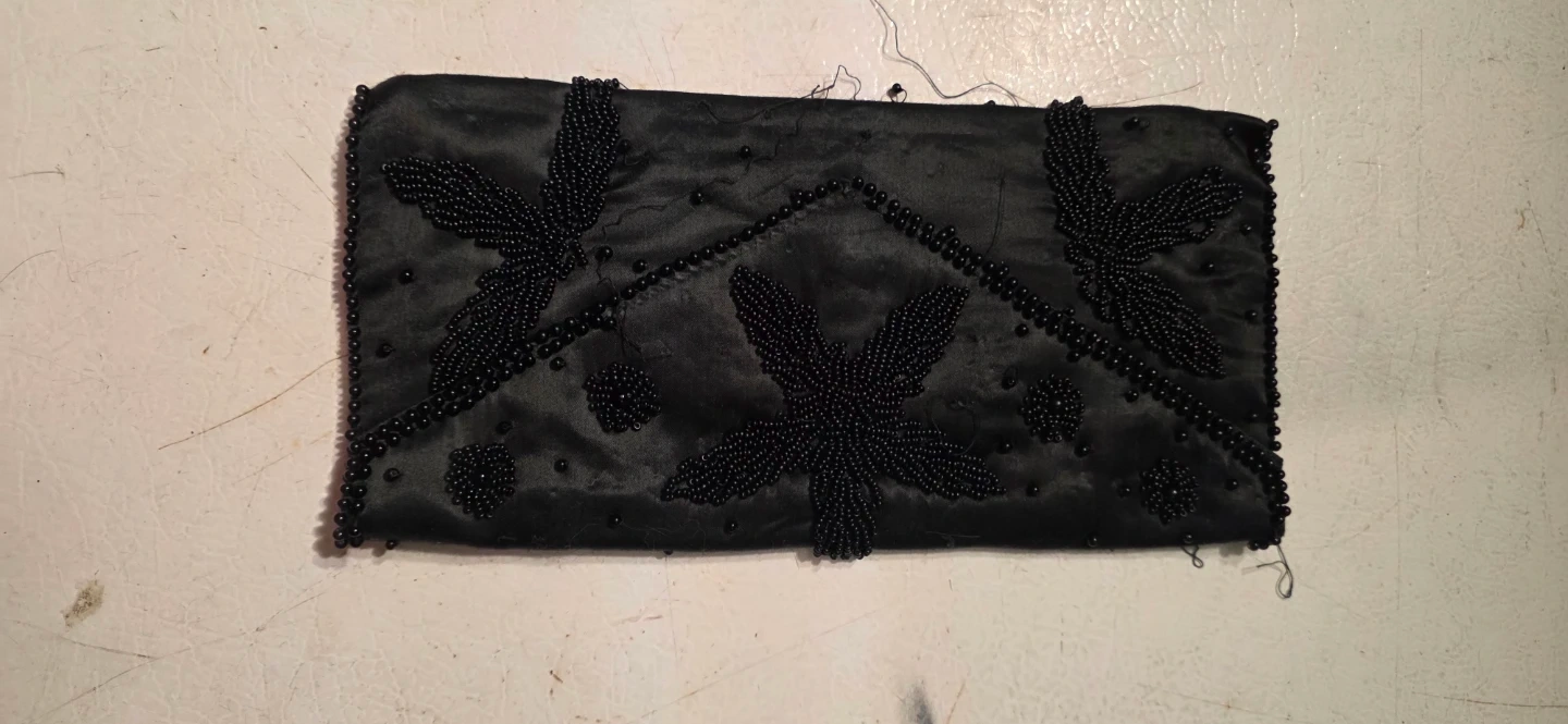 This is a black satin clutch purse embellished with black beads. The beadwork forms floral patterns on the front. It's suitable for evening wear or special occasions.