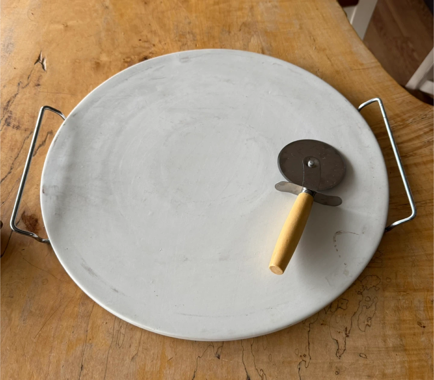 321Selling a large sized pizza stone with handles and a pizza cutter. It's in good condition and ready to help you make delicious homemade pizzas! Perfect for baking crispy crusts and evenly cooked toppings