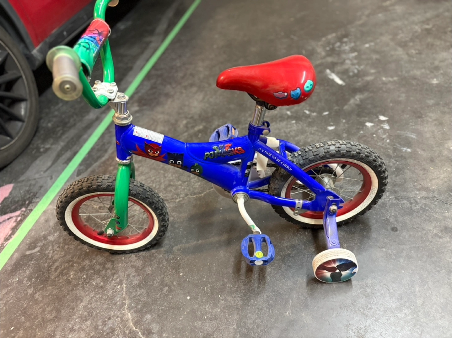 20Get your little one ready to roll with this fun PJ Masks themed bike! It's blue and green with red accents, and features the popular PJ Masks characters. It has training wheels, so it's perfect for kids who are just learning to ride. This bike is in good used condition and ready for a new adventure!