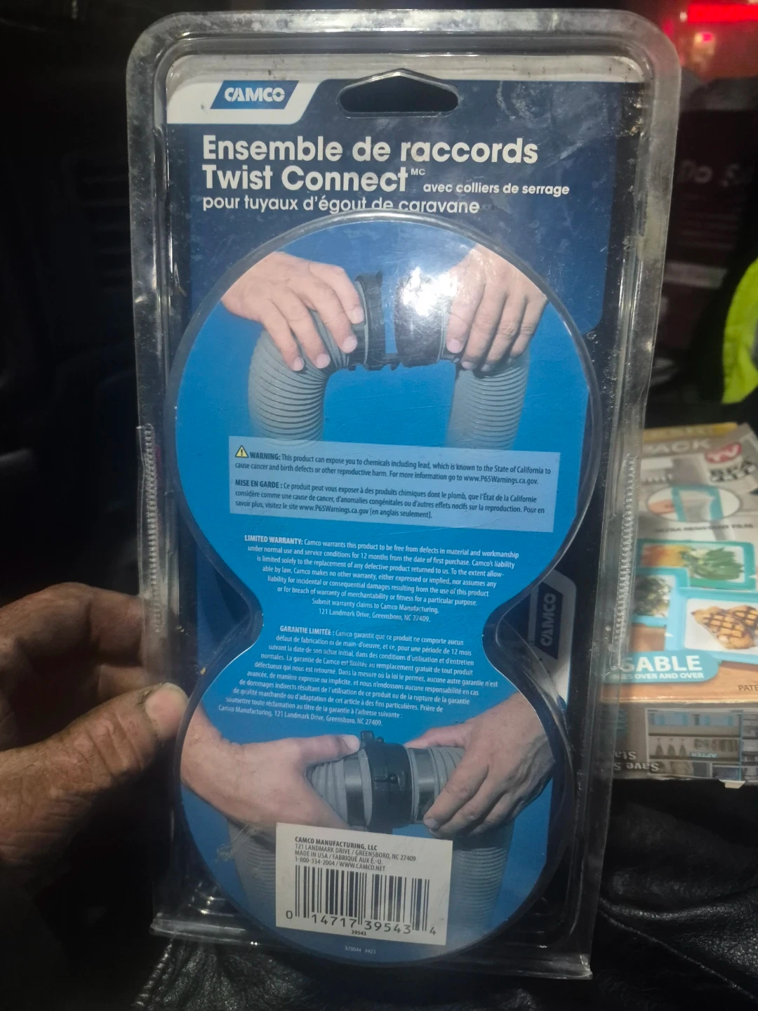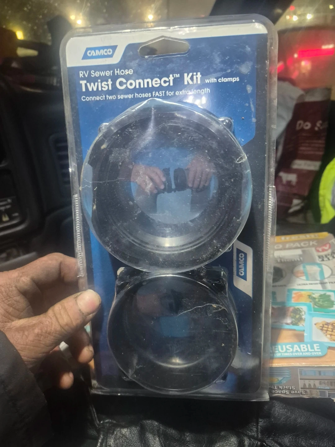 I'm selling a Camco RV Sewer Hose Twist Connect Kit with clamps. This kit connects two sewer hoses for extra length. It's brand new in the original packaging!