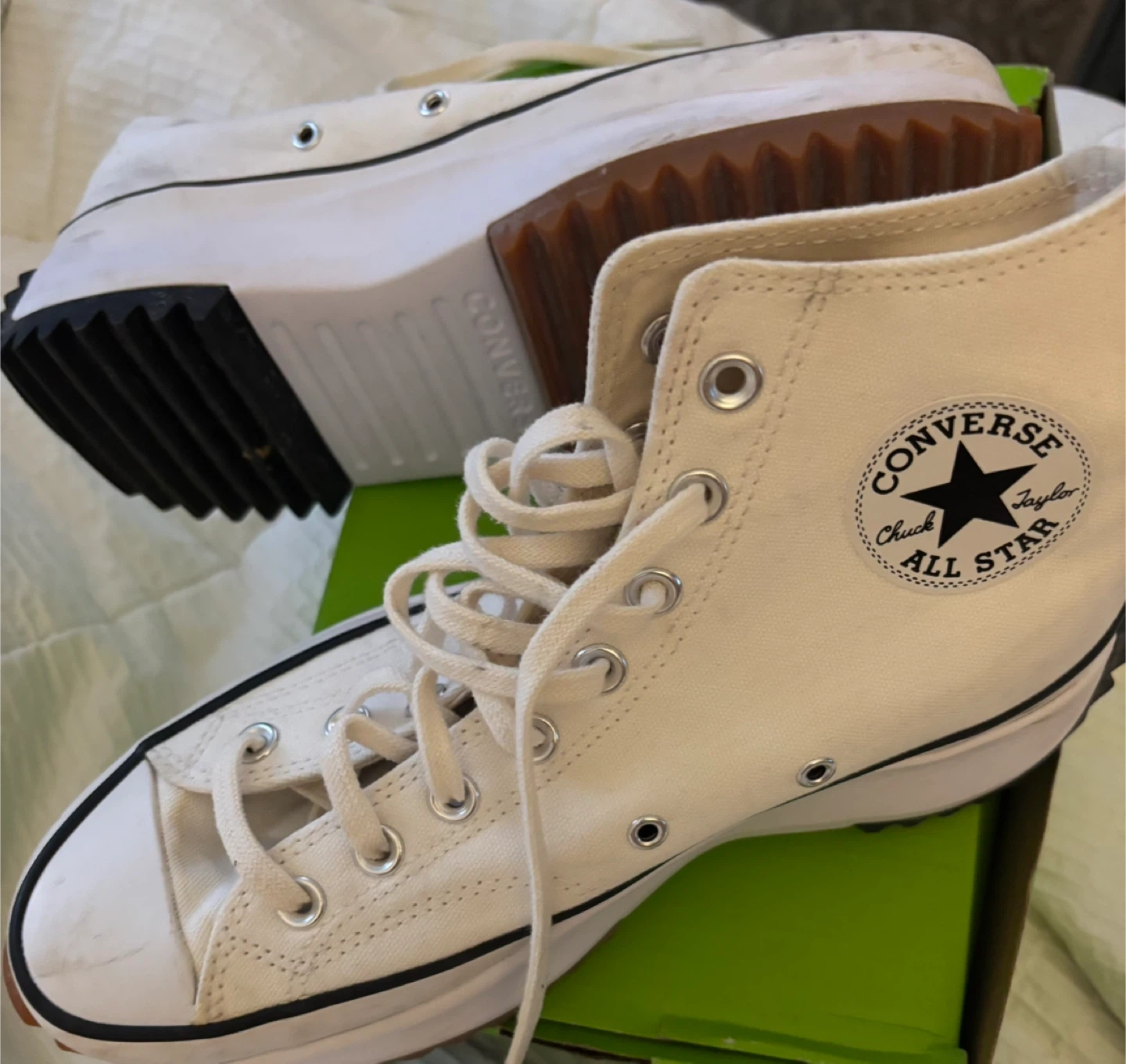White canvas Converse Run Star Hike high top sneakers. These shoes have a platform sole and the classic Chuck Taylor All Star logo patch. They're canvas material with a rubber sole. Women’s 9.5