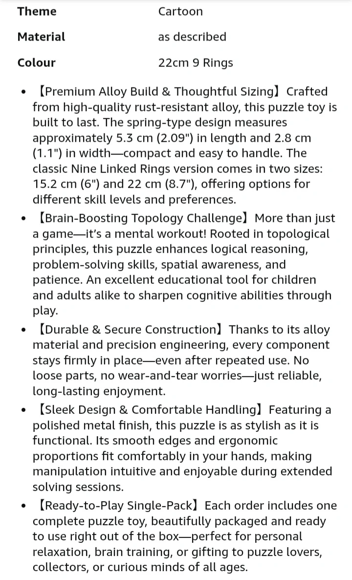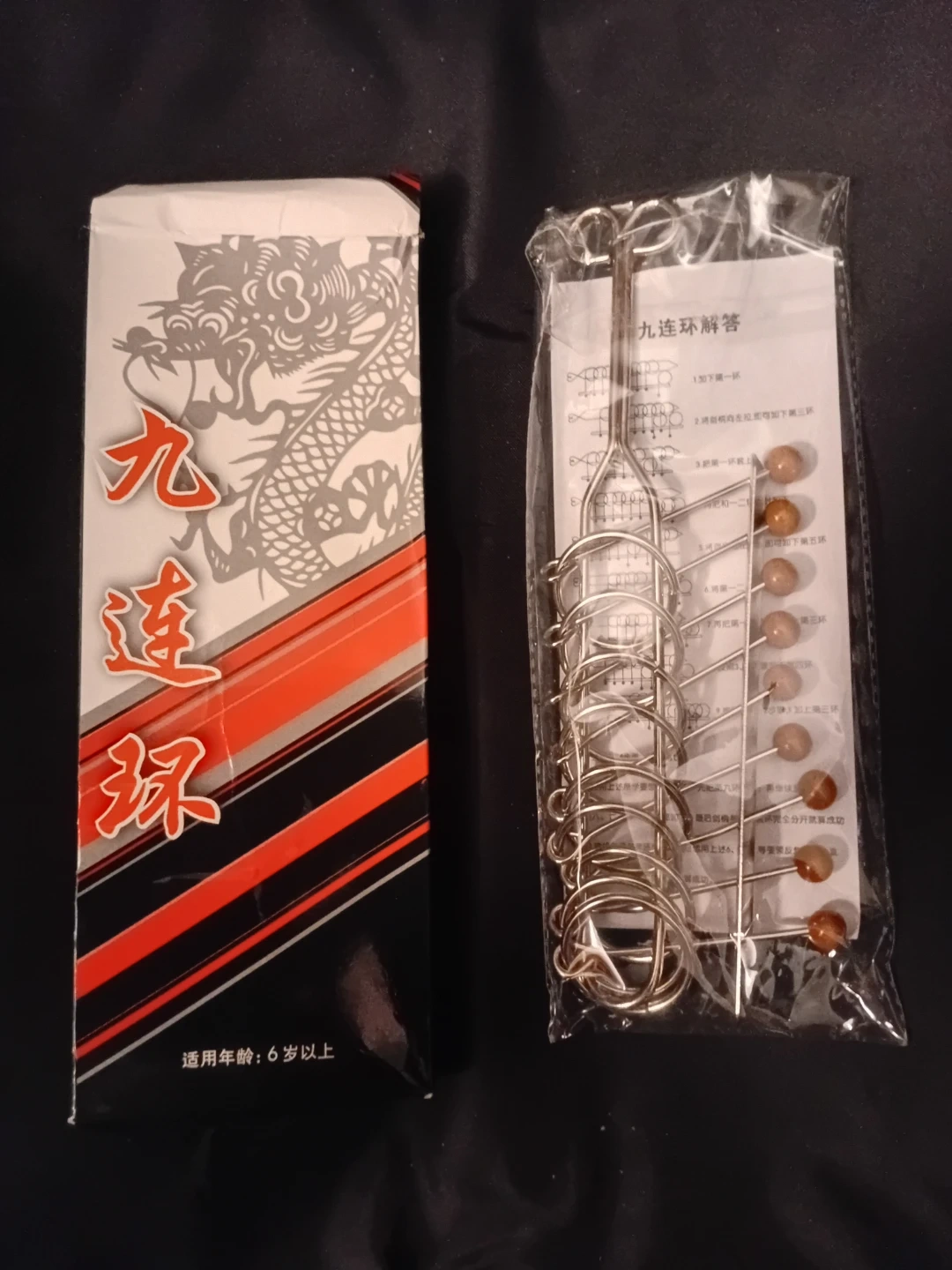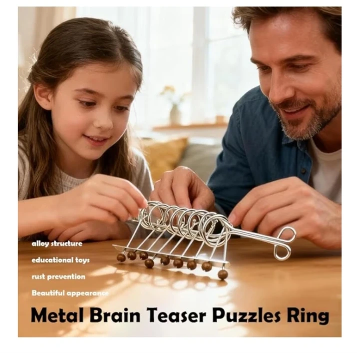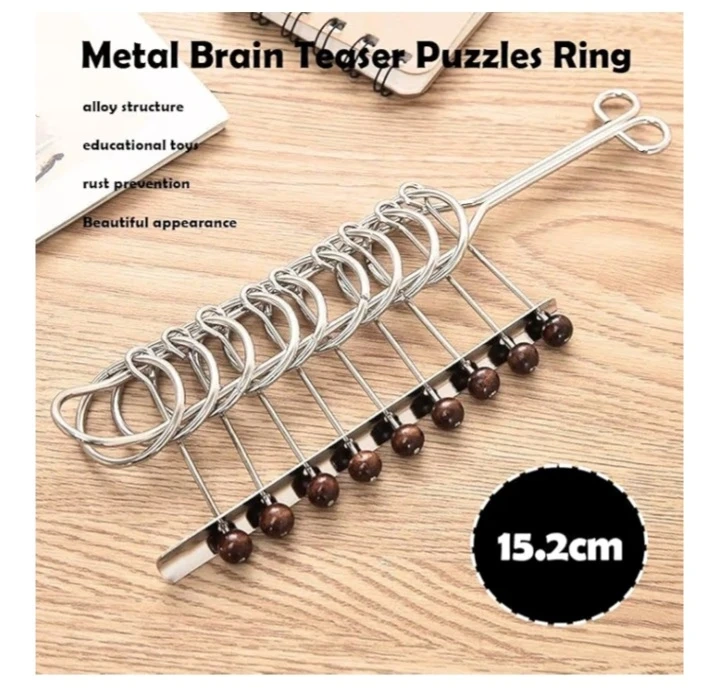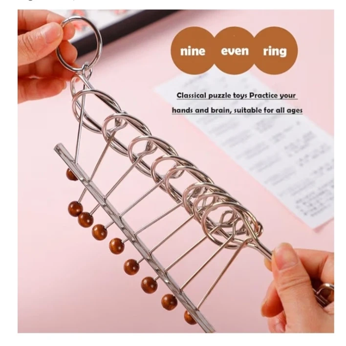 This is a metal brain teaser puzzle ring with an alloy structure. It features rust prevention and a beautiful appearance. The puzzle is educational and made with iron nickel plating material for a long service life. This is a classic Chinese 9 linked rings puzzle.