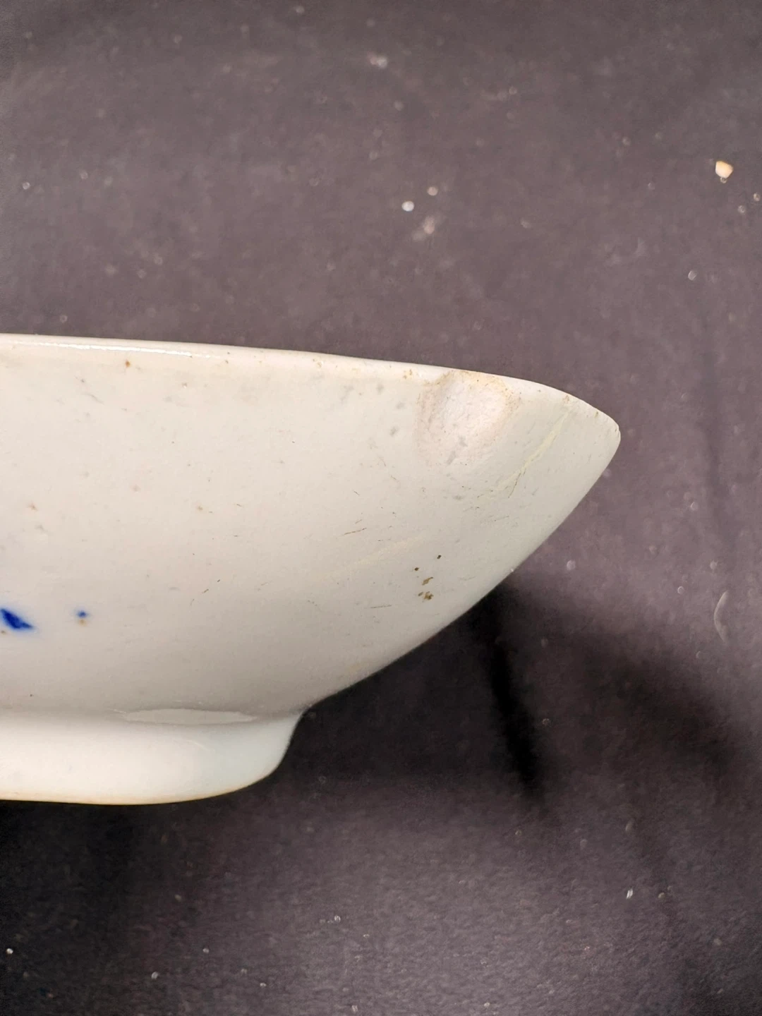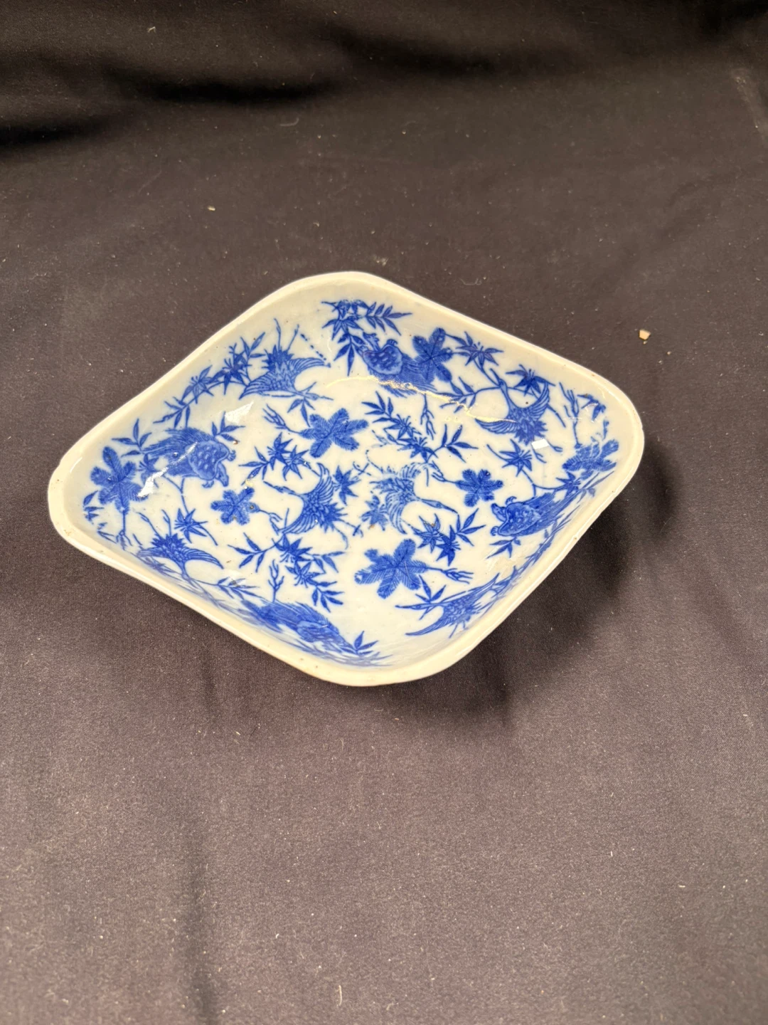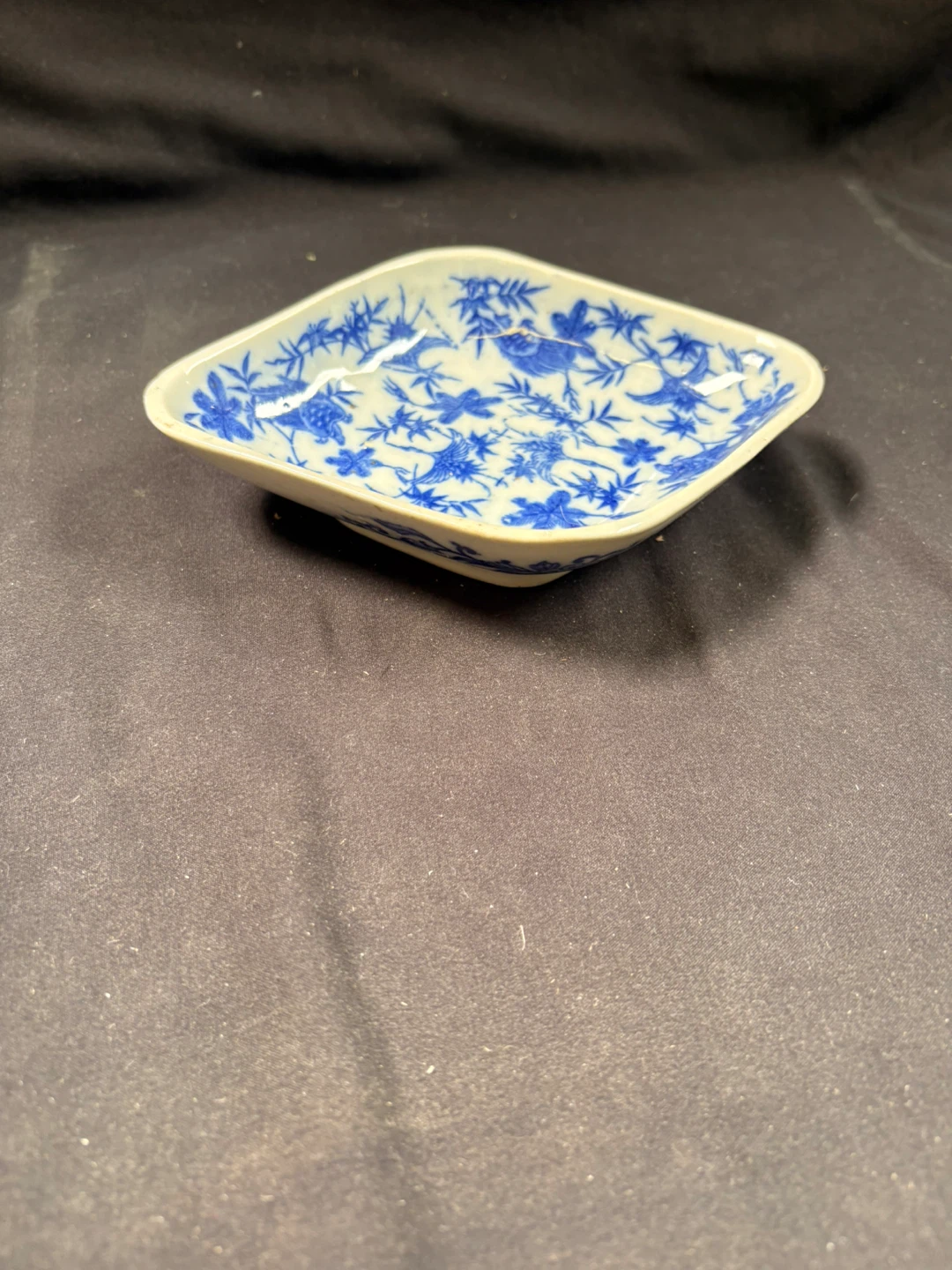 This is a small, decorative dish with a blue and white floral and bird pattern. It's a diamond shape with slightly raised edges. Ceramic material. (Has a small chip on corner)