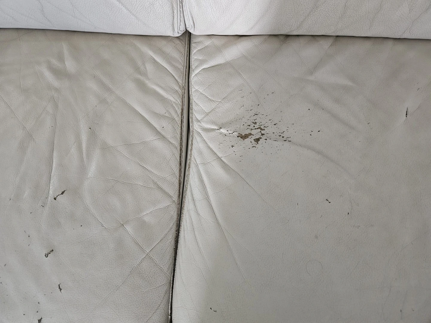 Pick up only, a comfy beige leather three-seater sofa. It has some wear and tear, as you can see in the pictures, but it's still got lots of life left in it! Perfect for a living room or den.