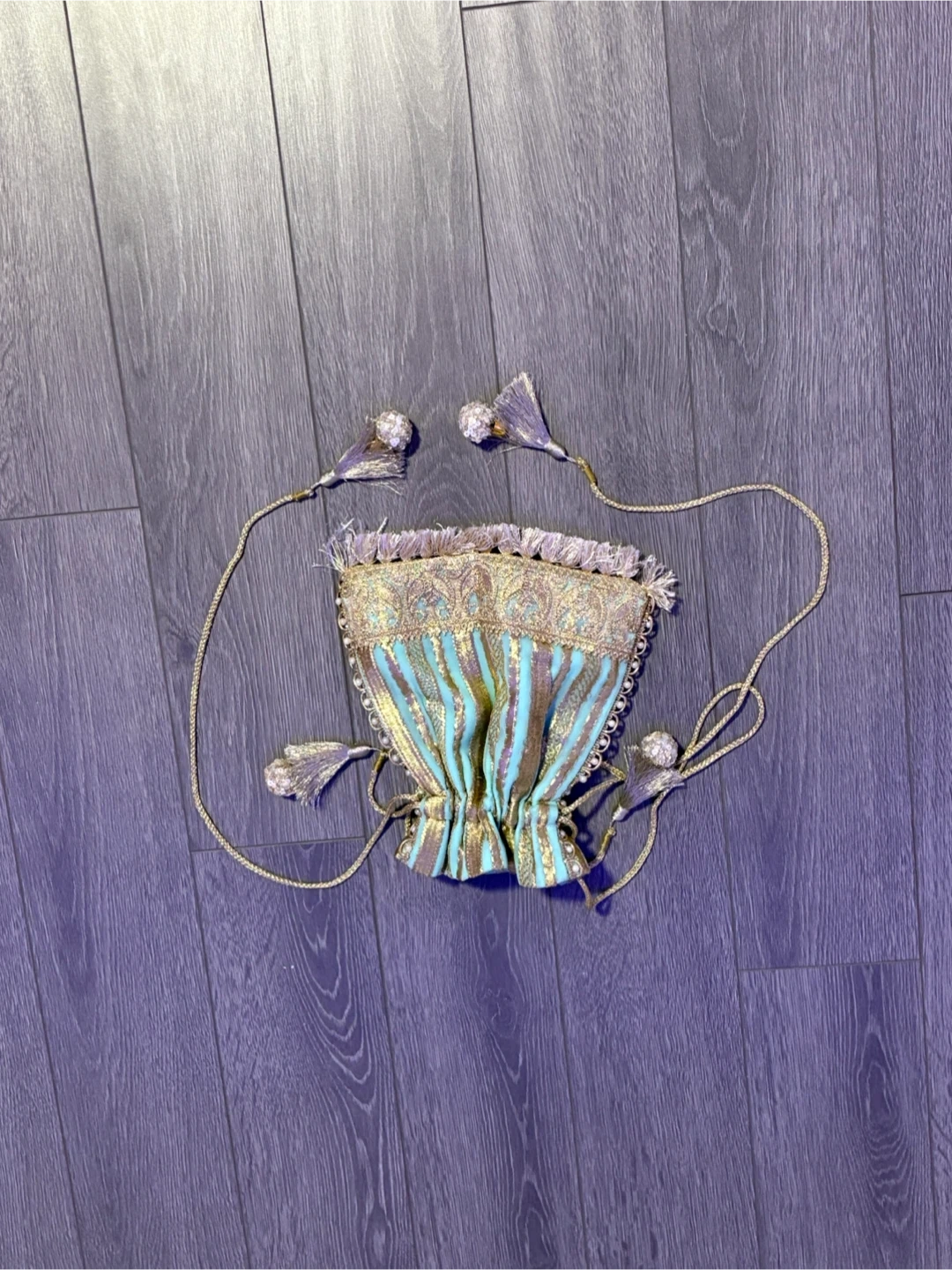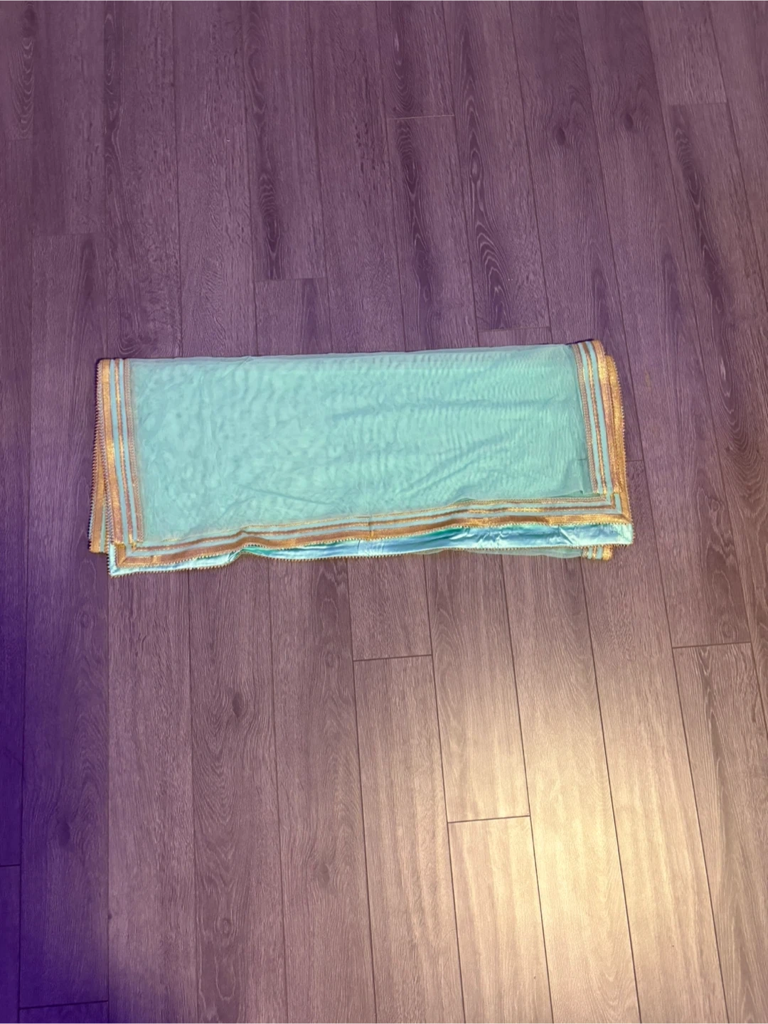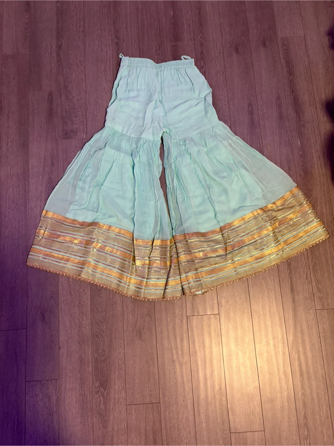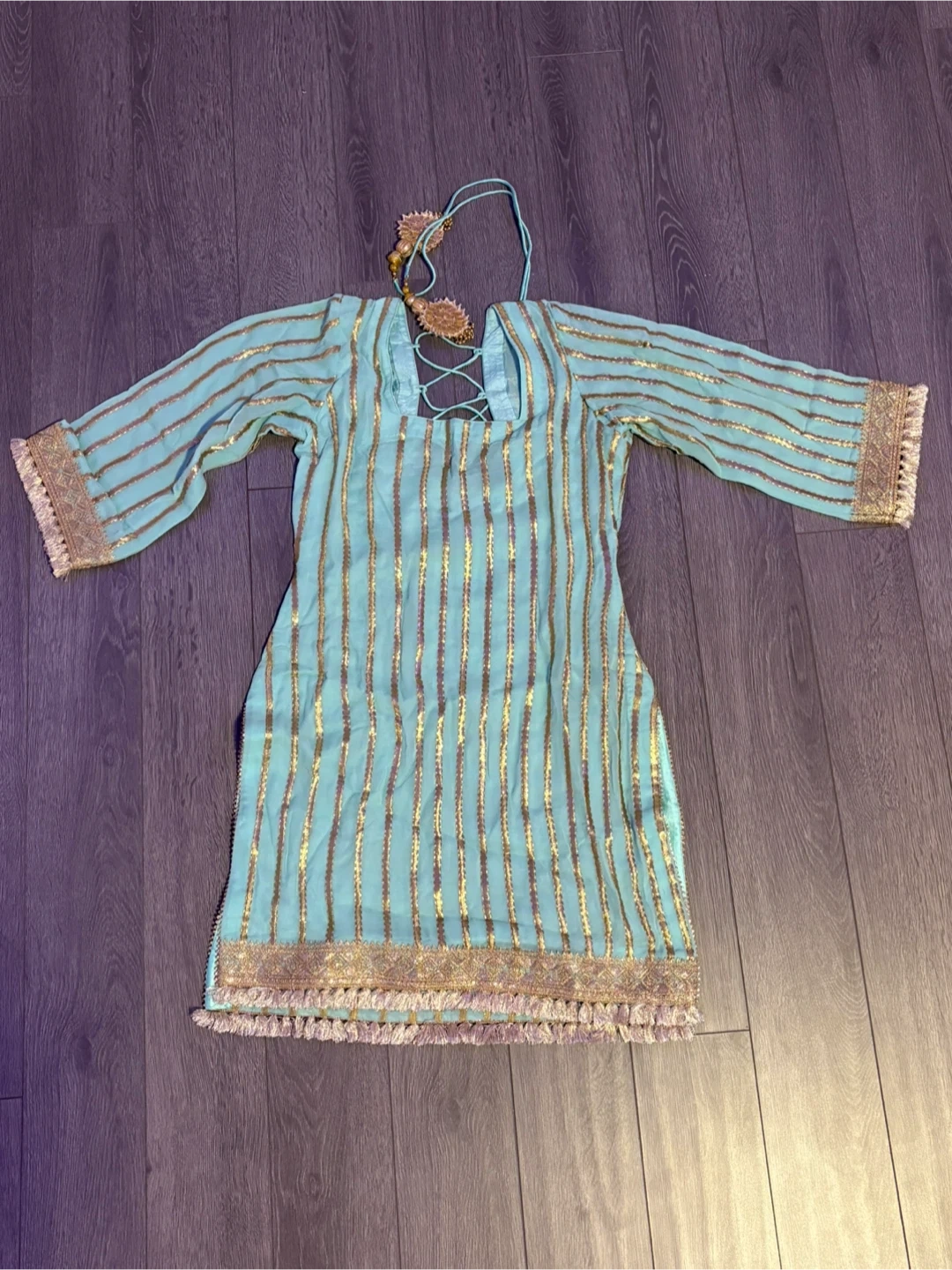 Selling a beautiful designer made Salwar Kameez set in light blue with gold detailing. Includes the top, pants, and a matching dupatta. Also comes with a matching potli. Perfect for a special occasion!