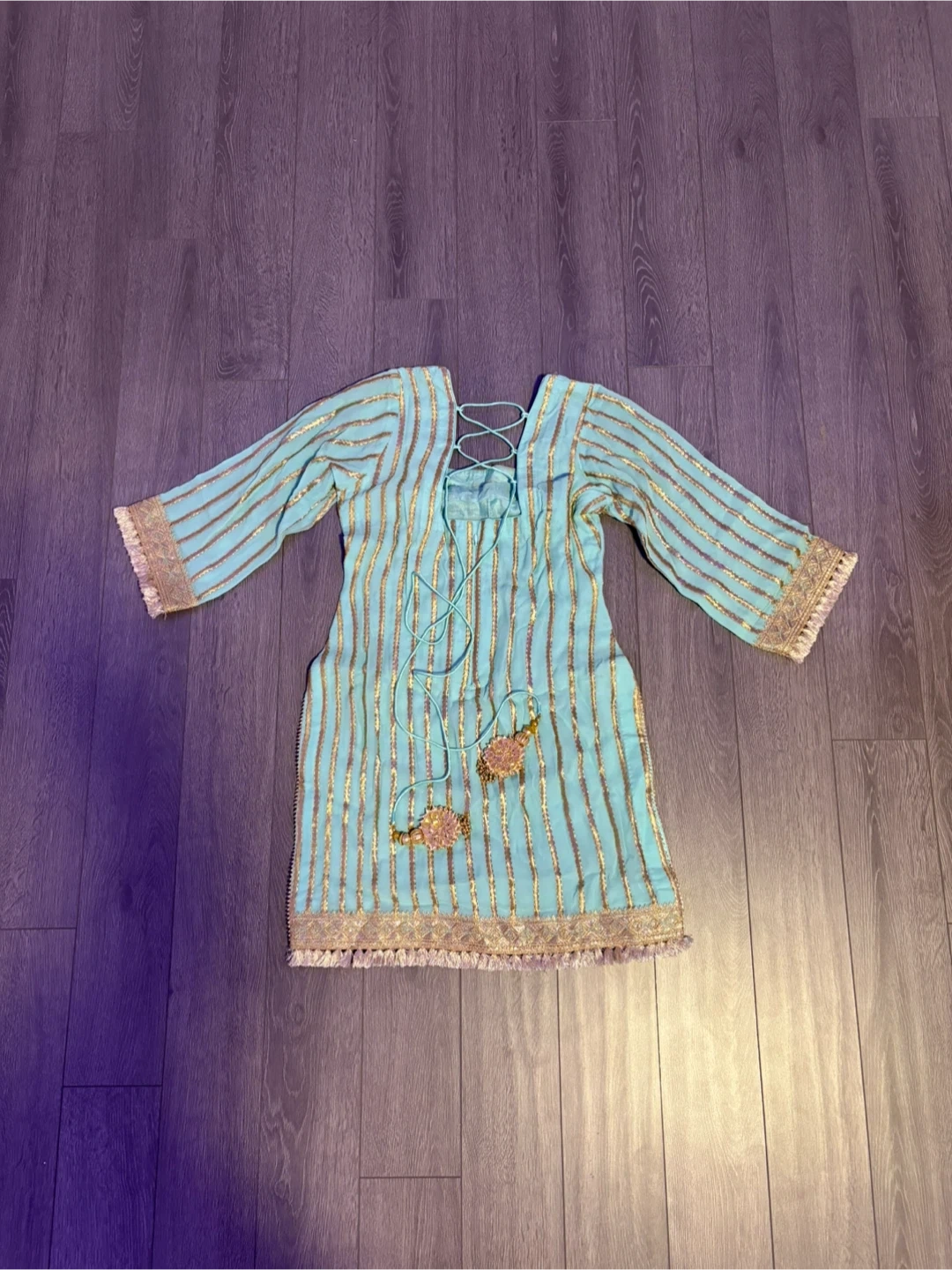Selling a beautiful designer made Salwar Kameez set in light blue with gold detailing. Includes the top, pants, and a matching dupatta. Also comes with a matching potli. Perfect for a special occasion!