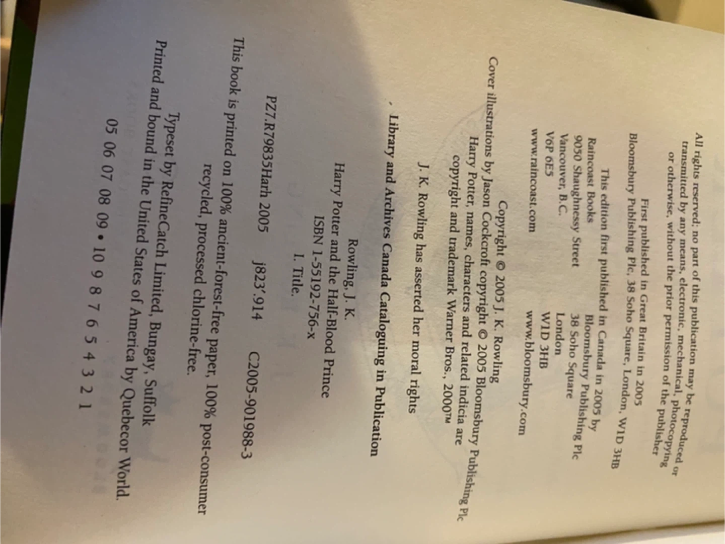 This is the book Harry Potter and the Half-Blood Prince by J.K. Rowling. It's printed on 100% ancient-forest-free paper, 100% post-consumer recycled, processed chlorine-free. The book was printed in Great Britain.