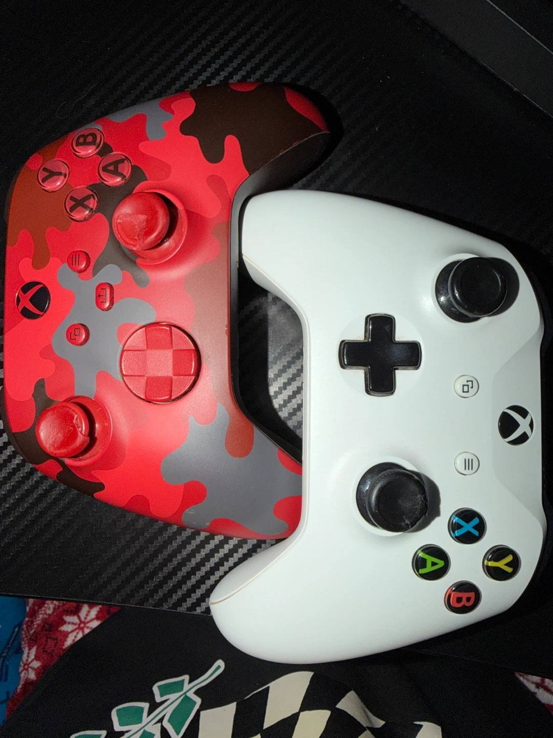 Selling two Xbox Wireless Controllers! One is a cool red camo design, and the other is classic white. Both are in good condition and only the thumbs ticks chew off.