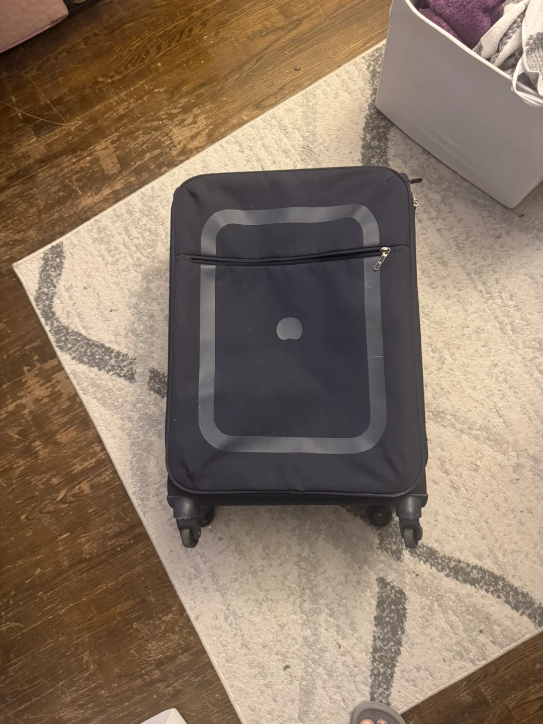 Delsey navy blue luggage, perfect for your next trip! It's a soft-sided suitcase with wheels. This bag has a zippered front pocket for easy access to essentials. It's lightweight and durable.