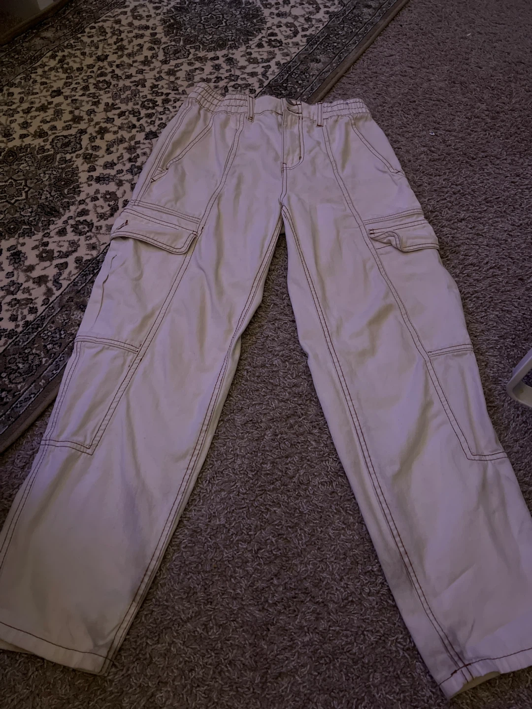 Selling a pair of beige cargo pants. They are in good condition and ready for a new owner! These are perfect for a casual and stylish look