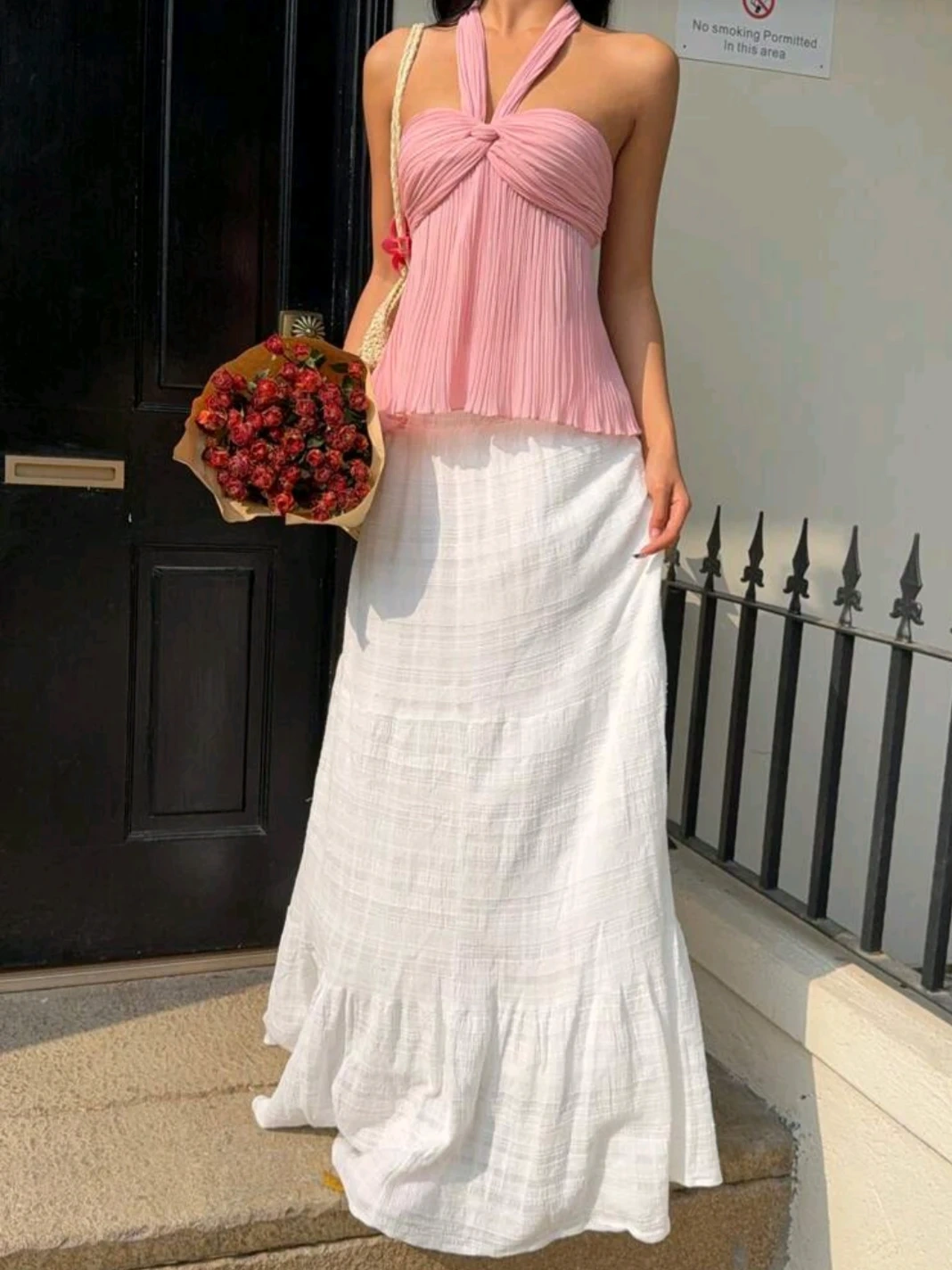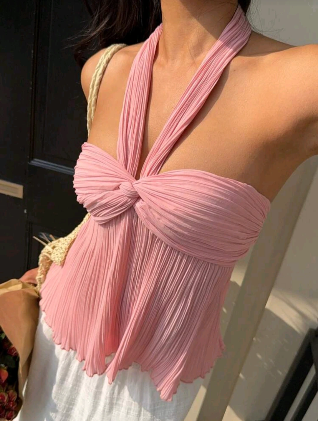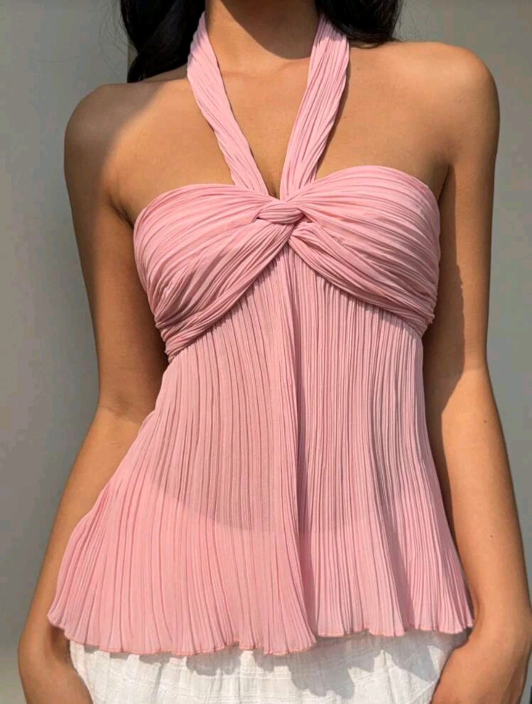 Pink halter neck top with a pleated bodice and twisted bust detail. It's a flowy style, perfect for warm weather!