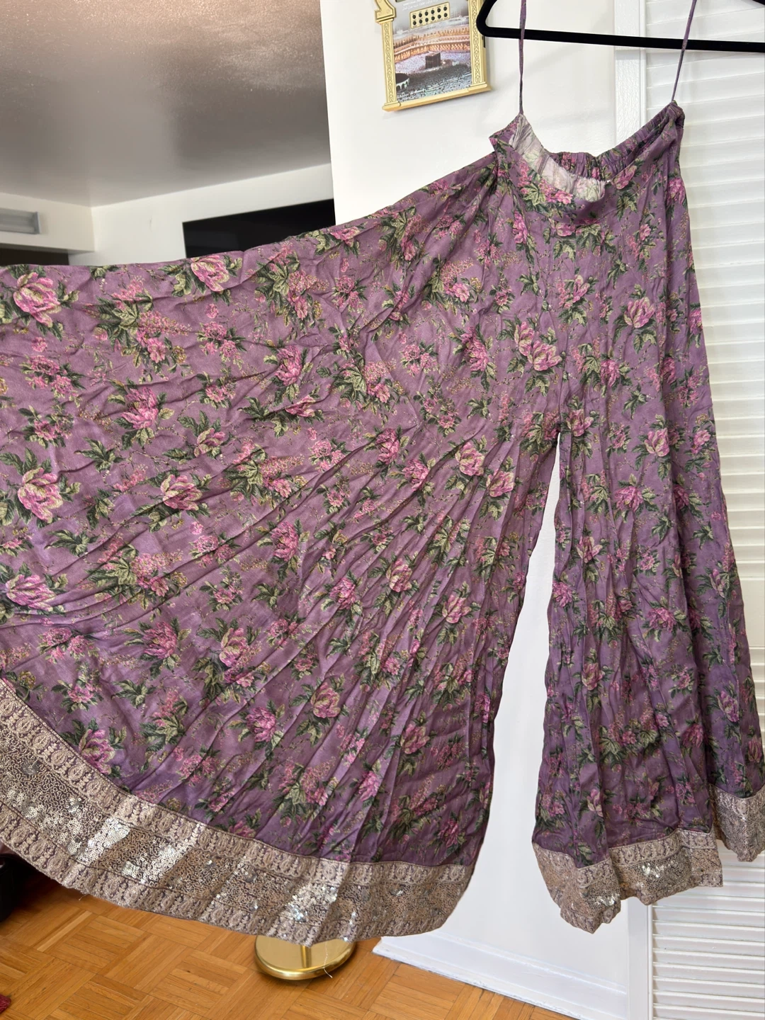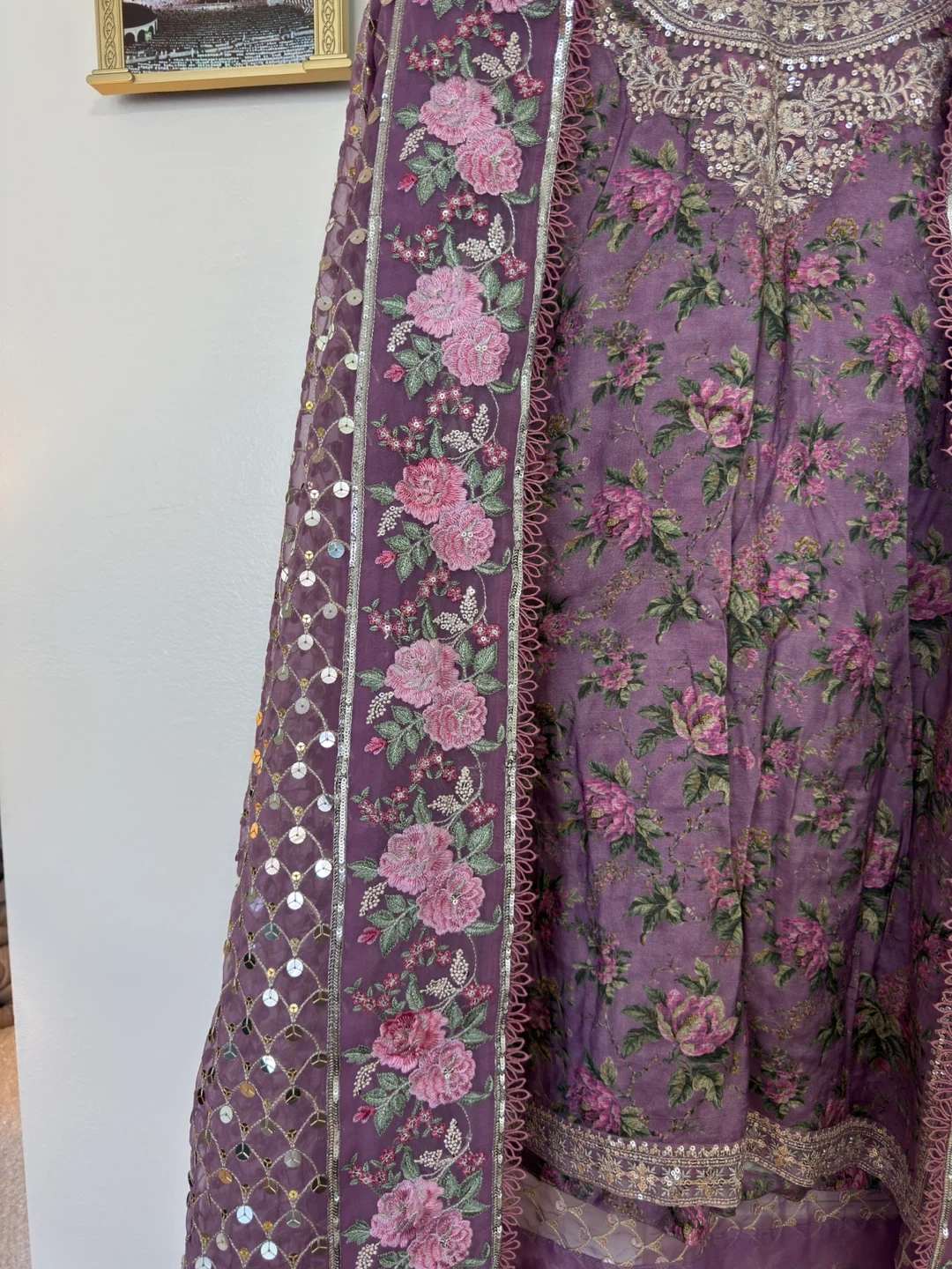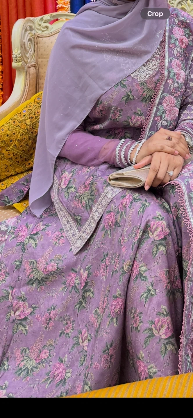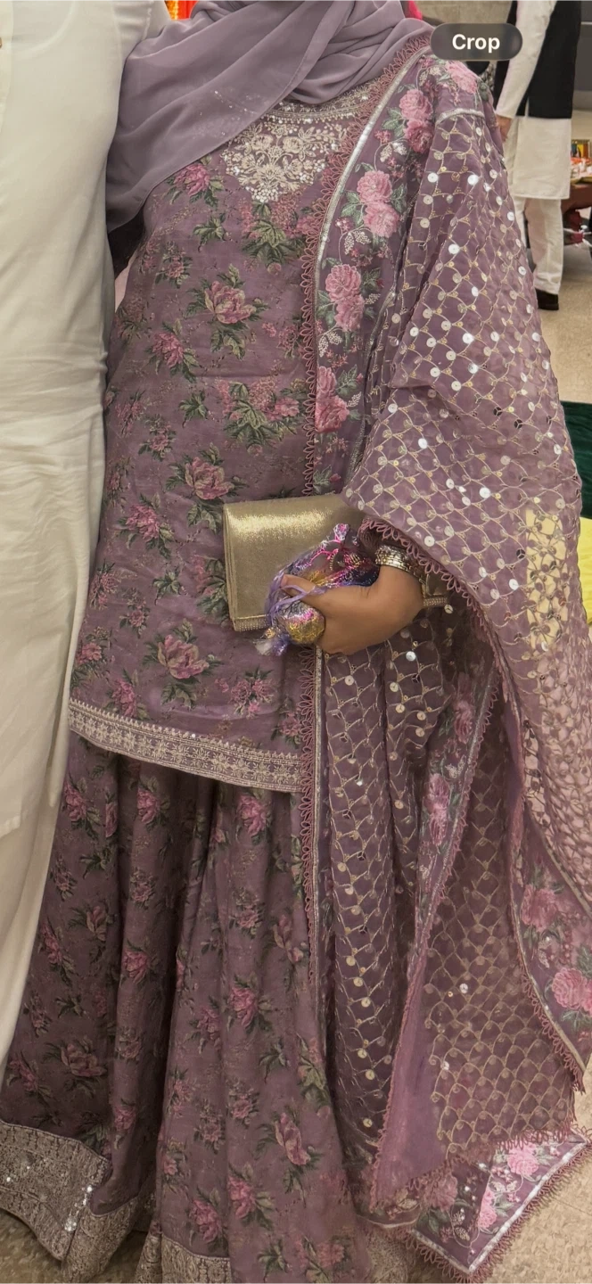 This is a beautiful purple outfit featuring a floral print. It includes a matching dupatta heavily embellished with sequins. It's perfect for special occasions!