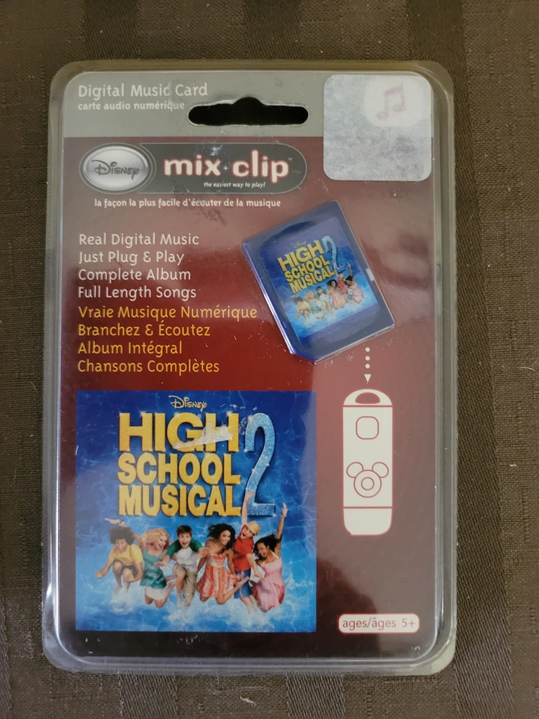 Real digital music on a just plug & play card. This card contains the complete album with full-length songs from High School Musical 2. Ages 5 and up. Four cards available.