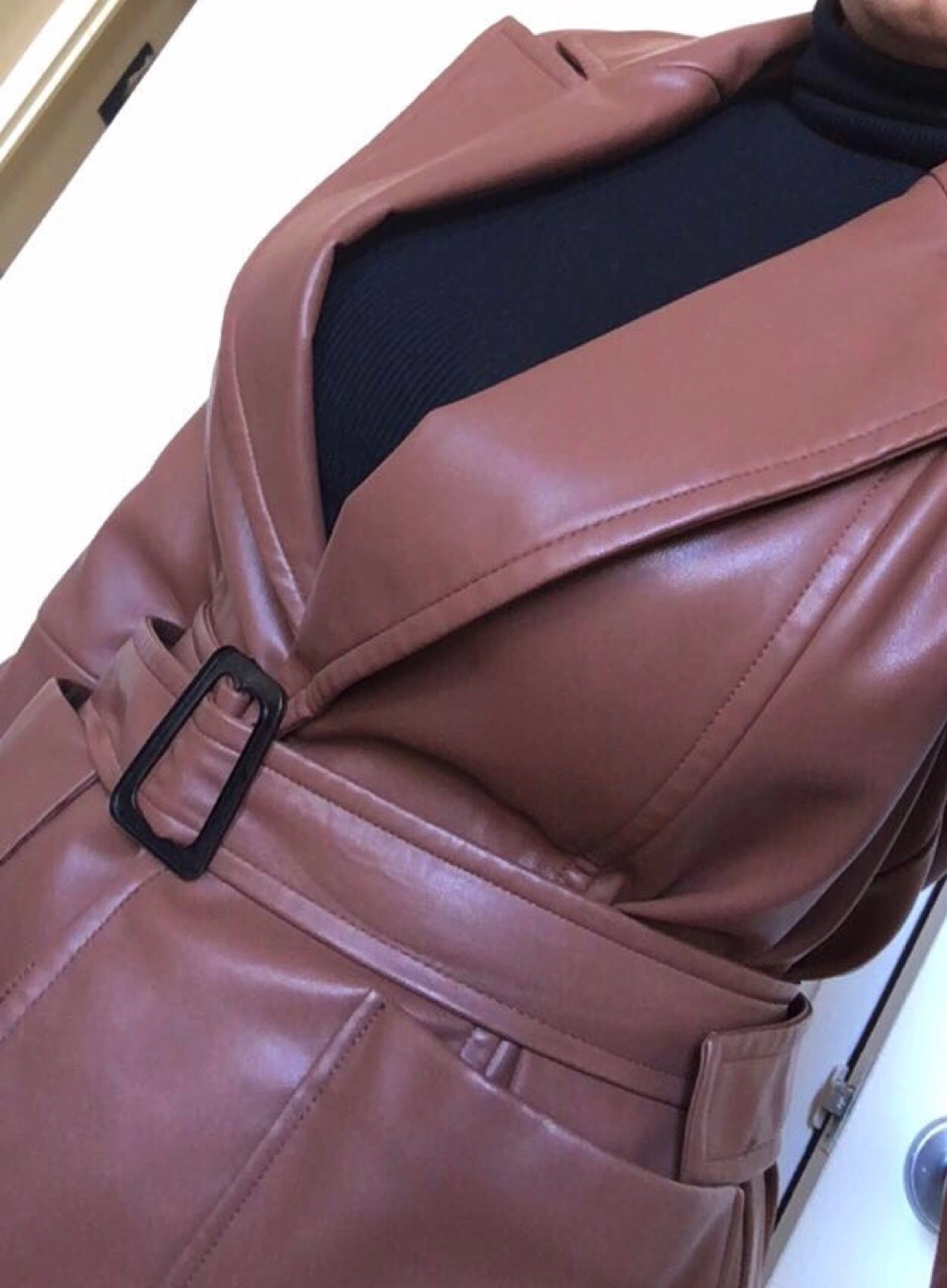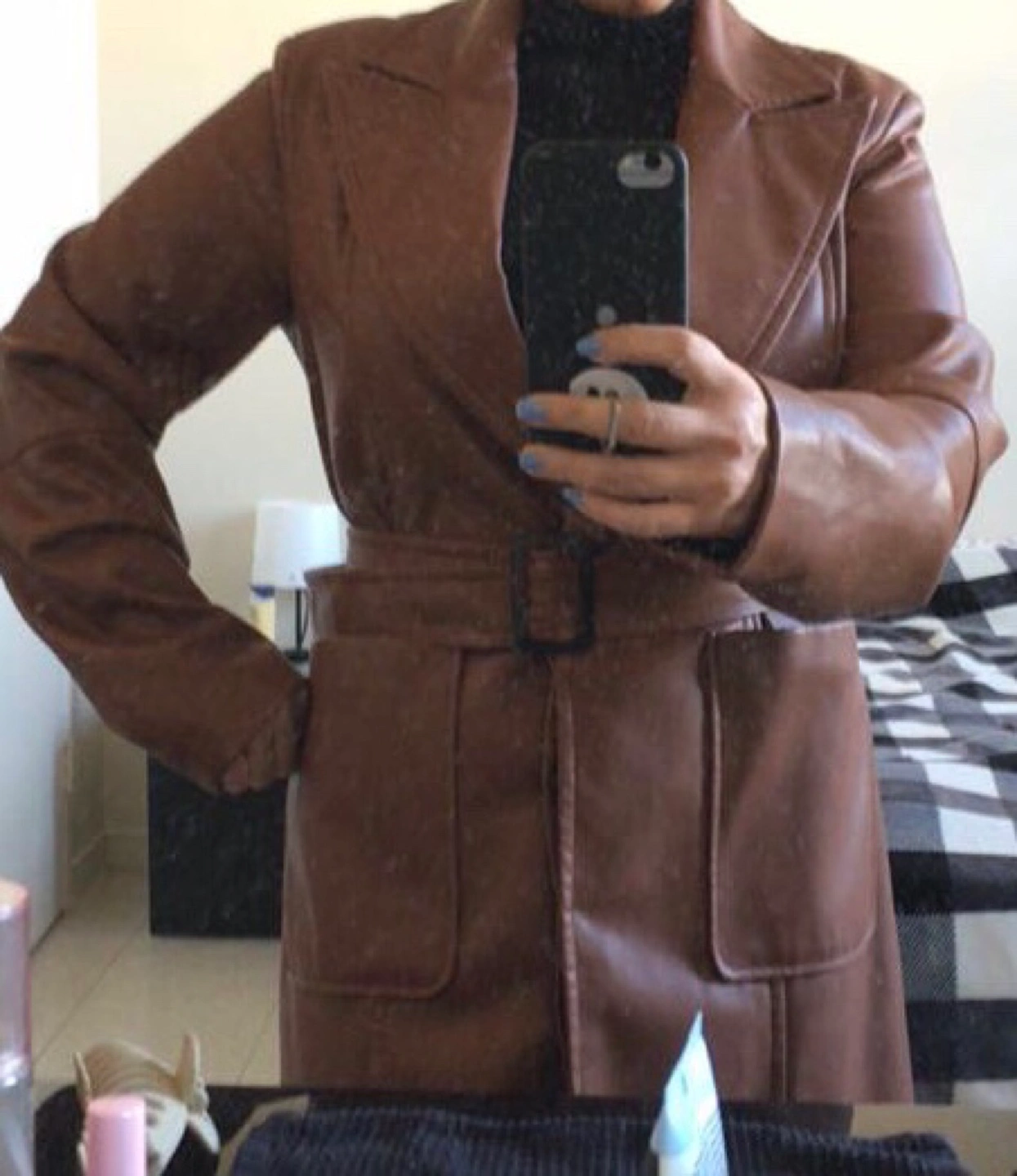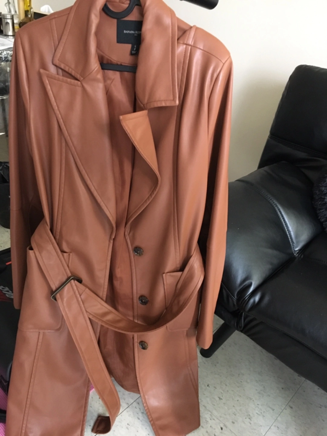Brown faux leather trench coat by Banana Republic. It's a size small with a belt and button closure. Looks sharp!