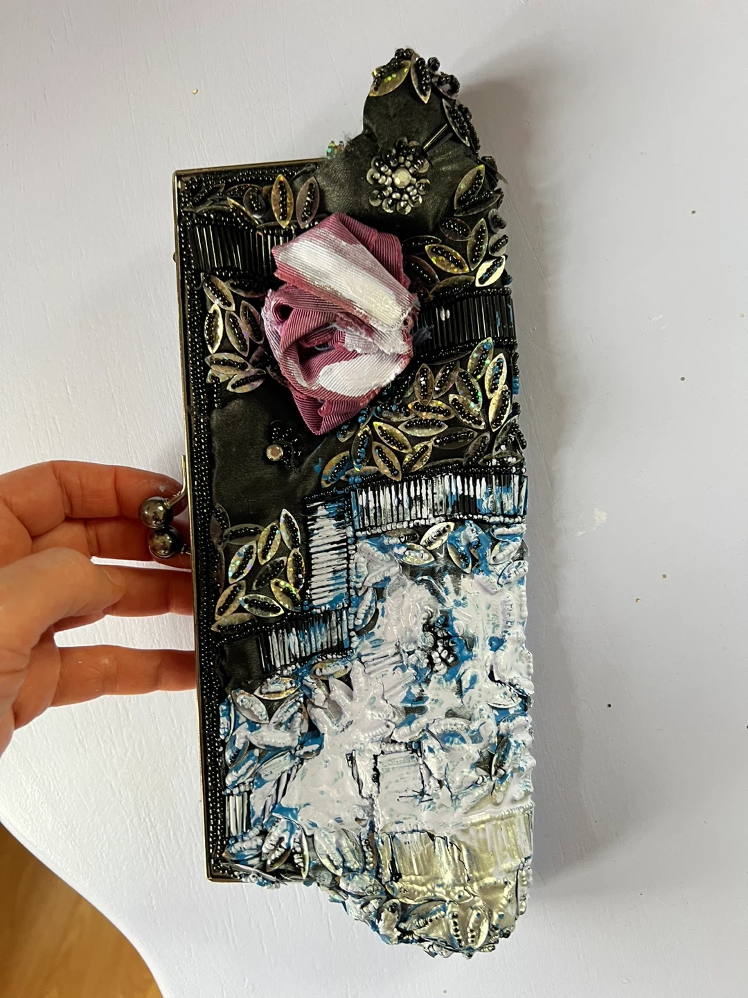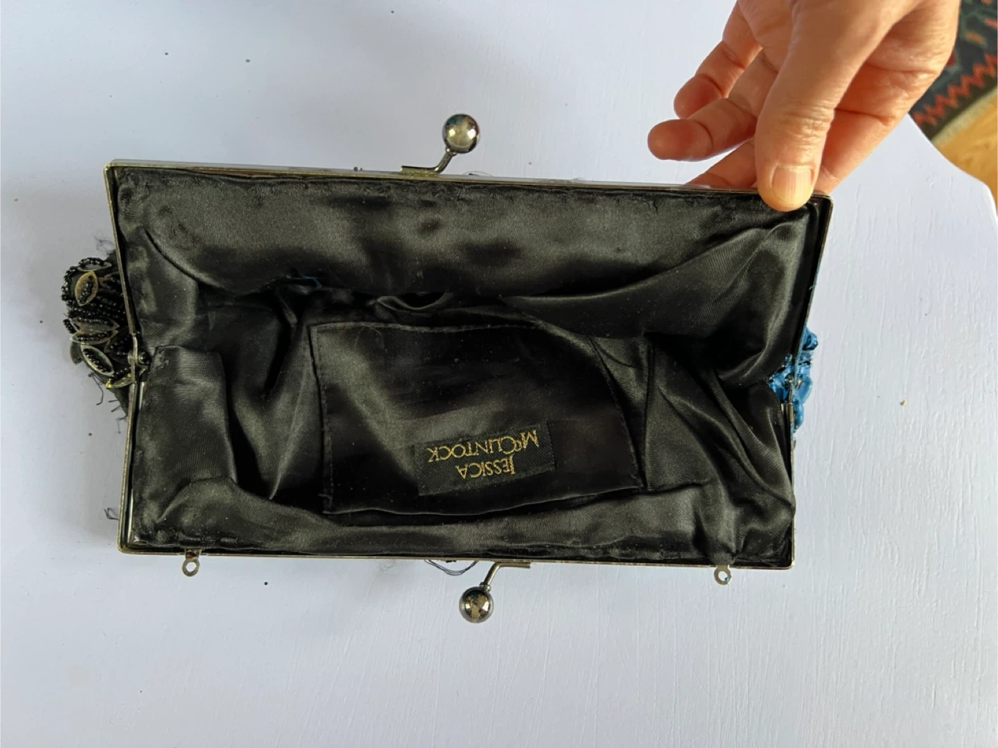 Selling a beautiful Jessica McClintock beaded clutch! It features intricate beadwork and a unique design, perfect for a special occasion or adding a touch of elegance to any outfit. The inside is lined with black satin.