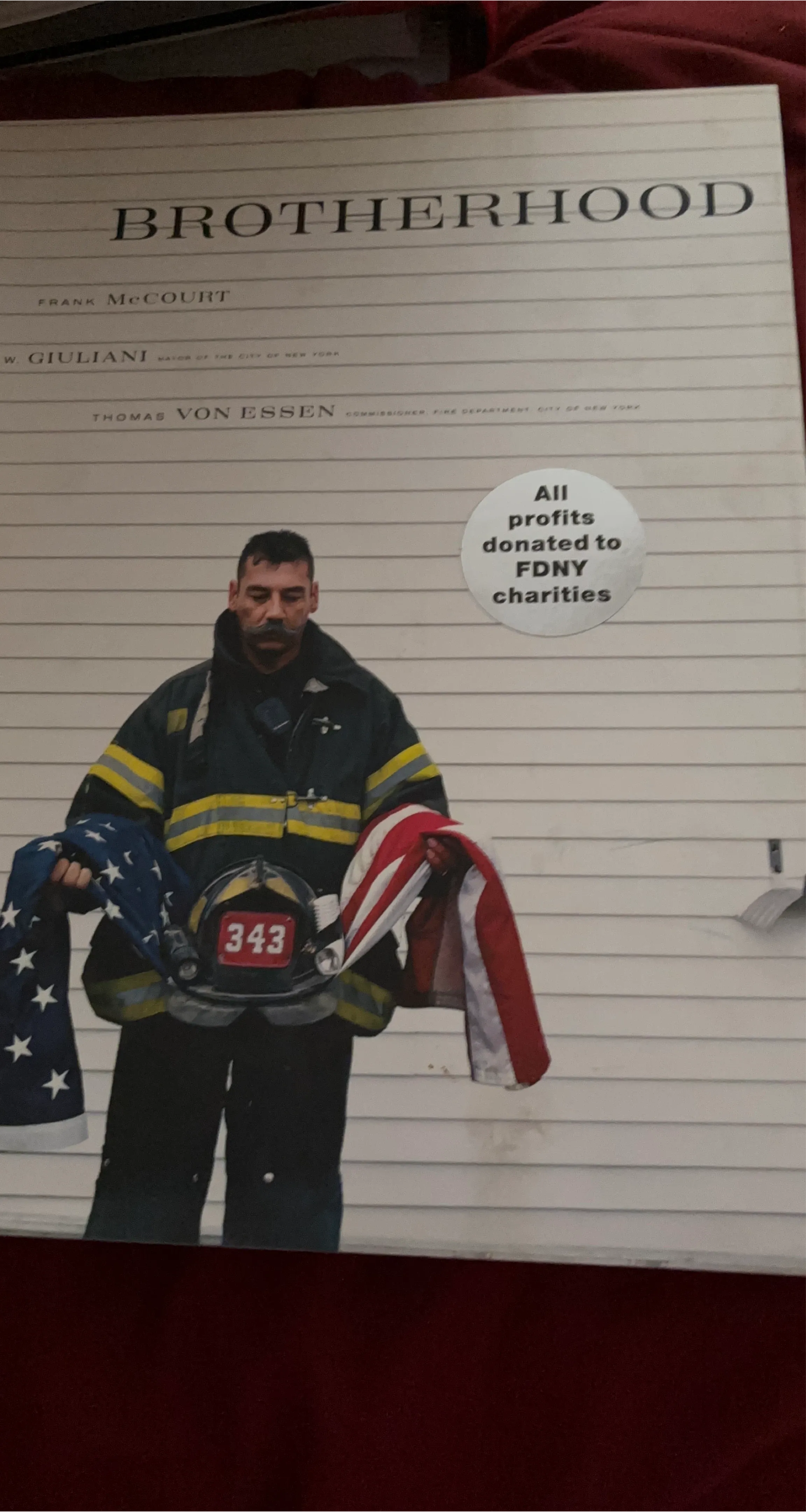 This book is titled Brotherhood and is written by Frank McCourt. It features contributions from W. Giuliani and Thomas Von Essen. All profits are donated to FDNY charities.