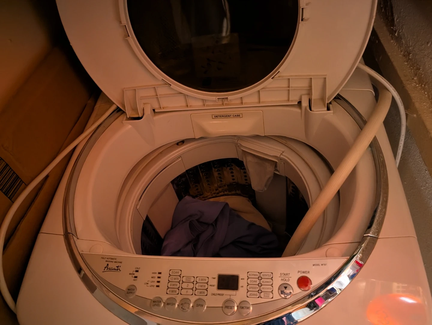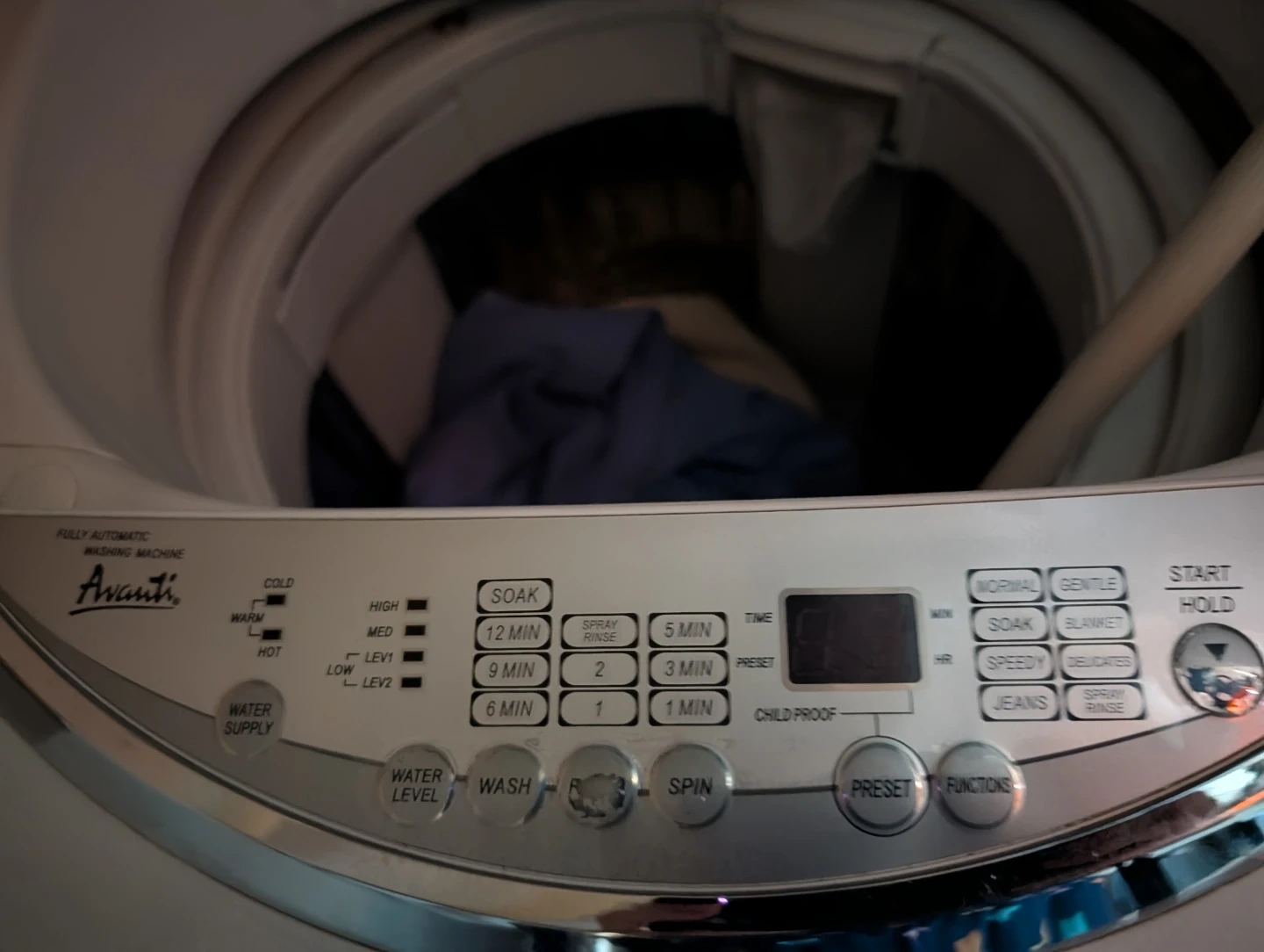 This is an Avanti fully automatic washing machine. It offers various wash cycles including normal, gentle, soak, blanket, speedy, delicate, and jeans. It also features multiple water levels and spin options.
