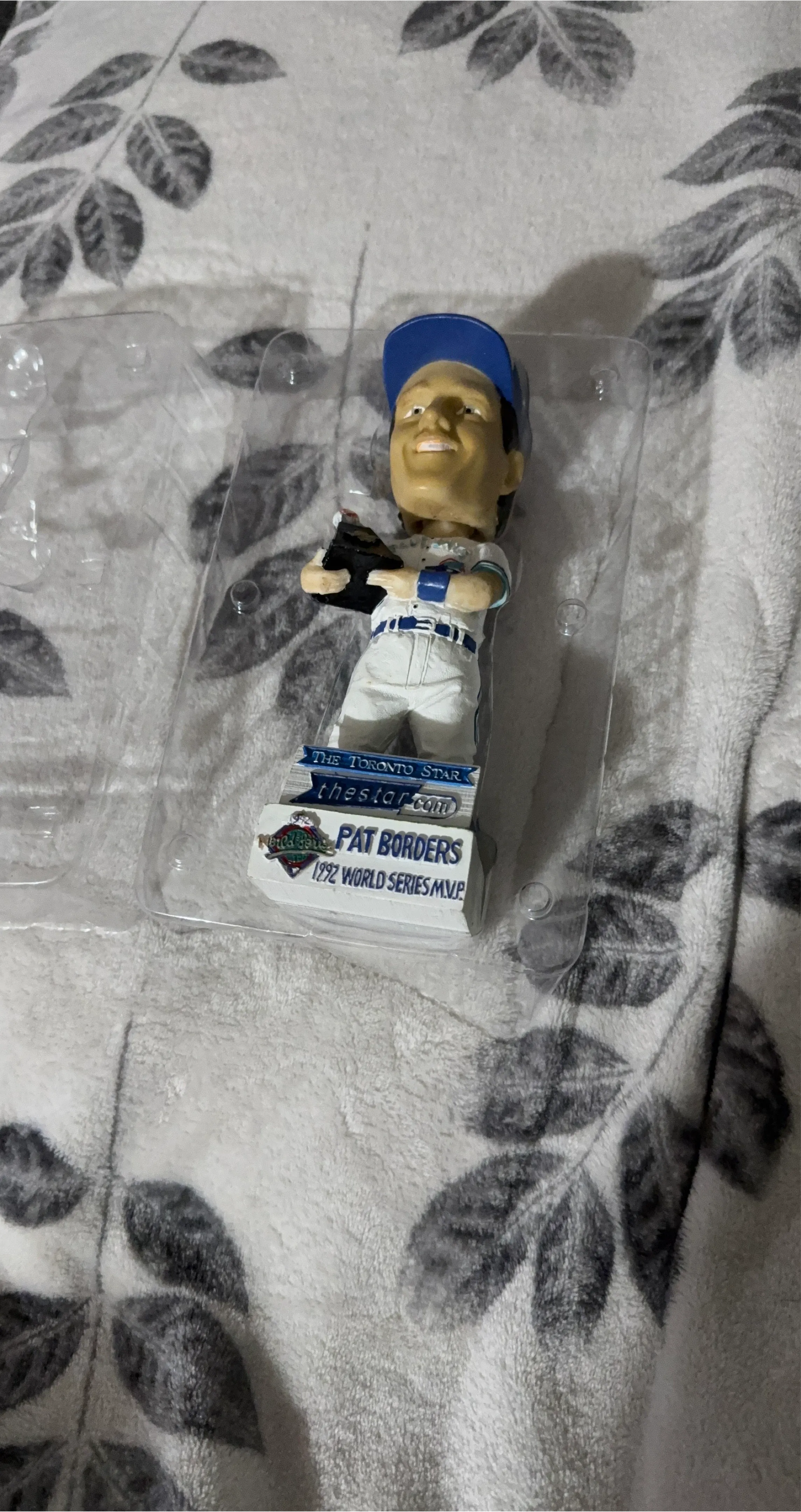 This is a Toronto Star bobblehead featuring Pat Borders. It commemorates his 1992 World Series MVP award. The bobblehead is still in its original plastic packaging. (There are 2 of these bobble heads 25$ each)