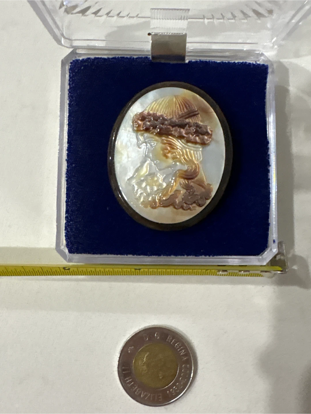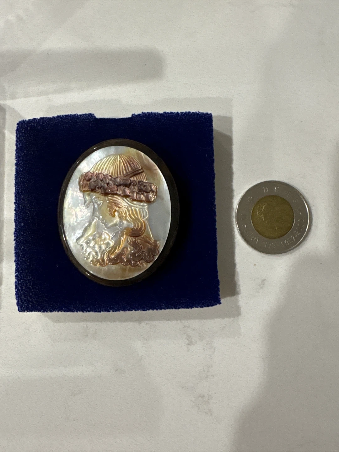 Selling a unique piece of magnetic health jewellery! It's a brooch featuring a cameo design, encased in a clear box. A stylish accessory with potential health benefits