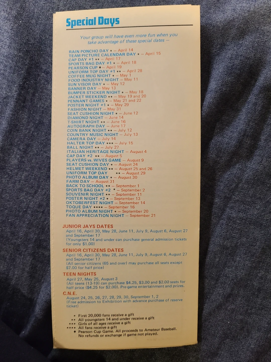 This is the 1979 Toronto Blue Jays schedule. It includes special days, junior Jays days, senior citizens days, and teen nights. The back provides seating information and how to order group tickets.