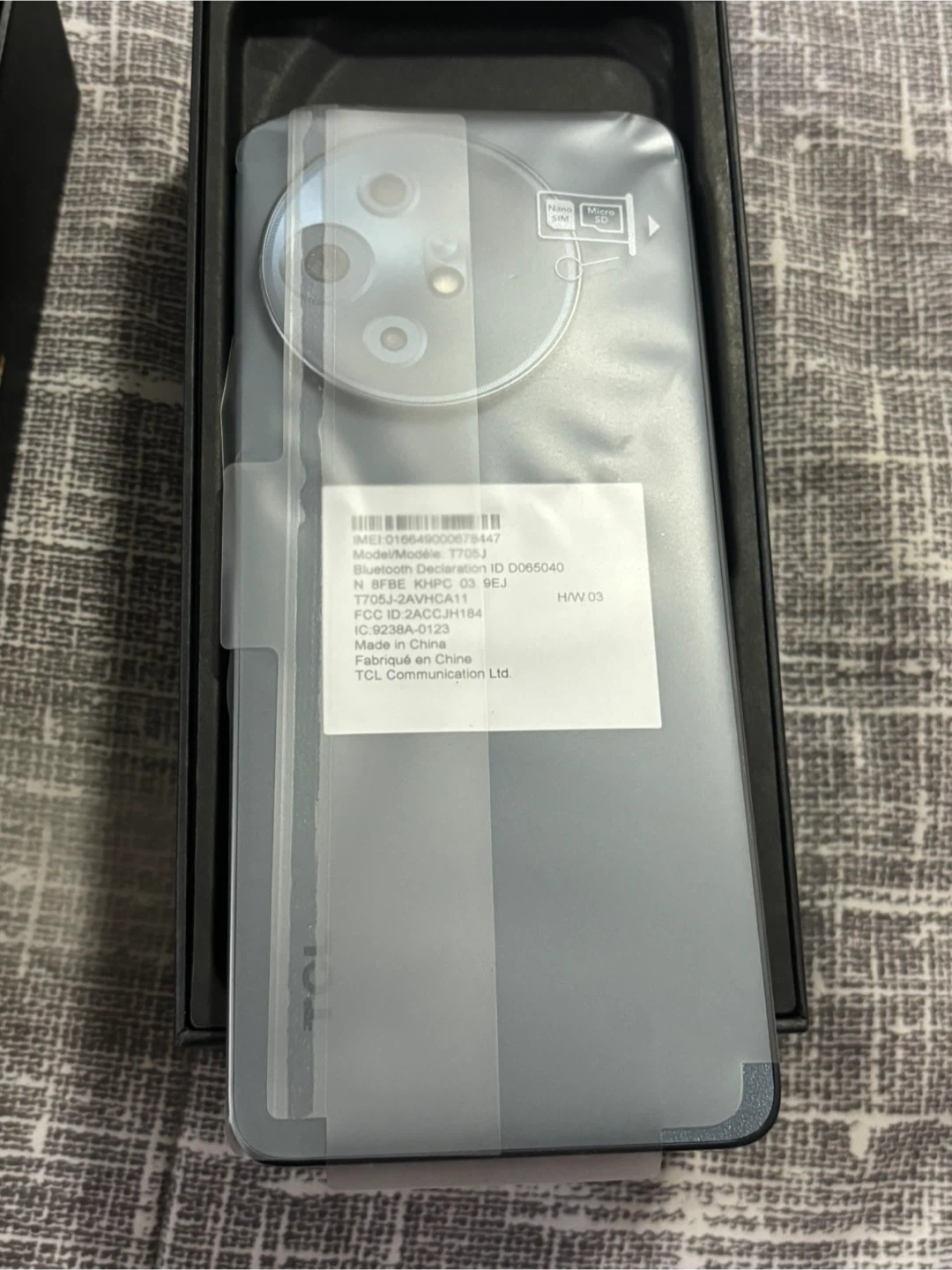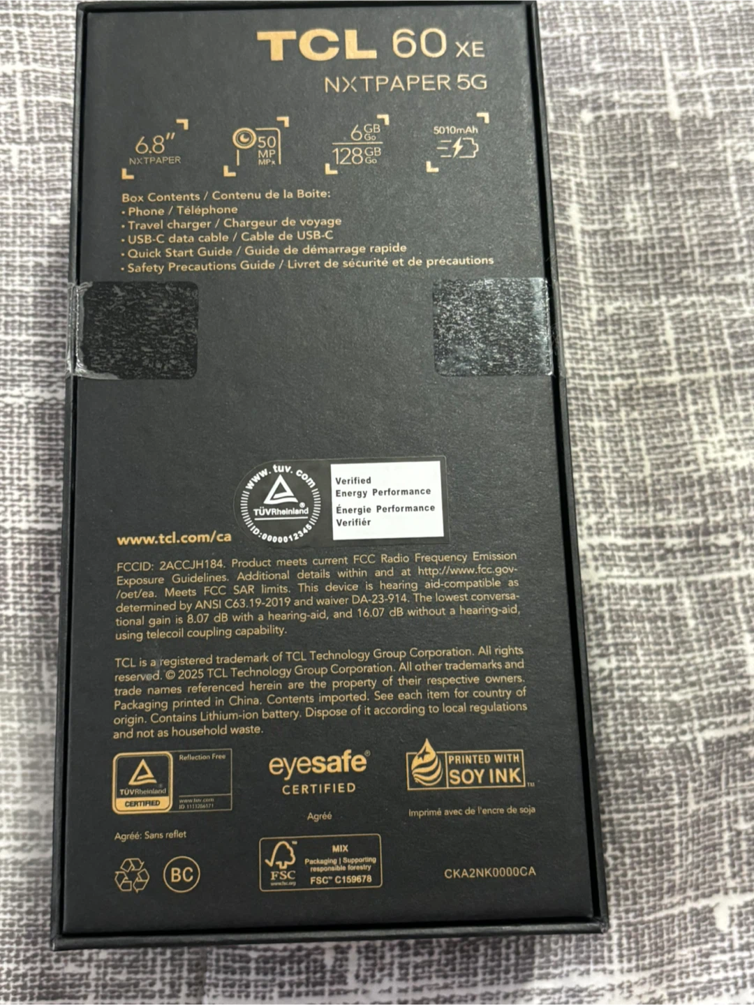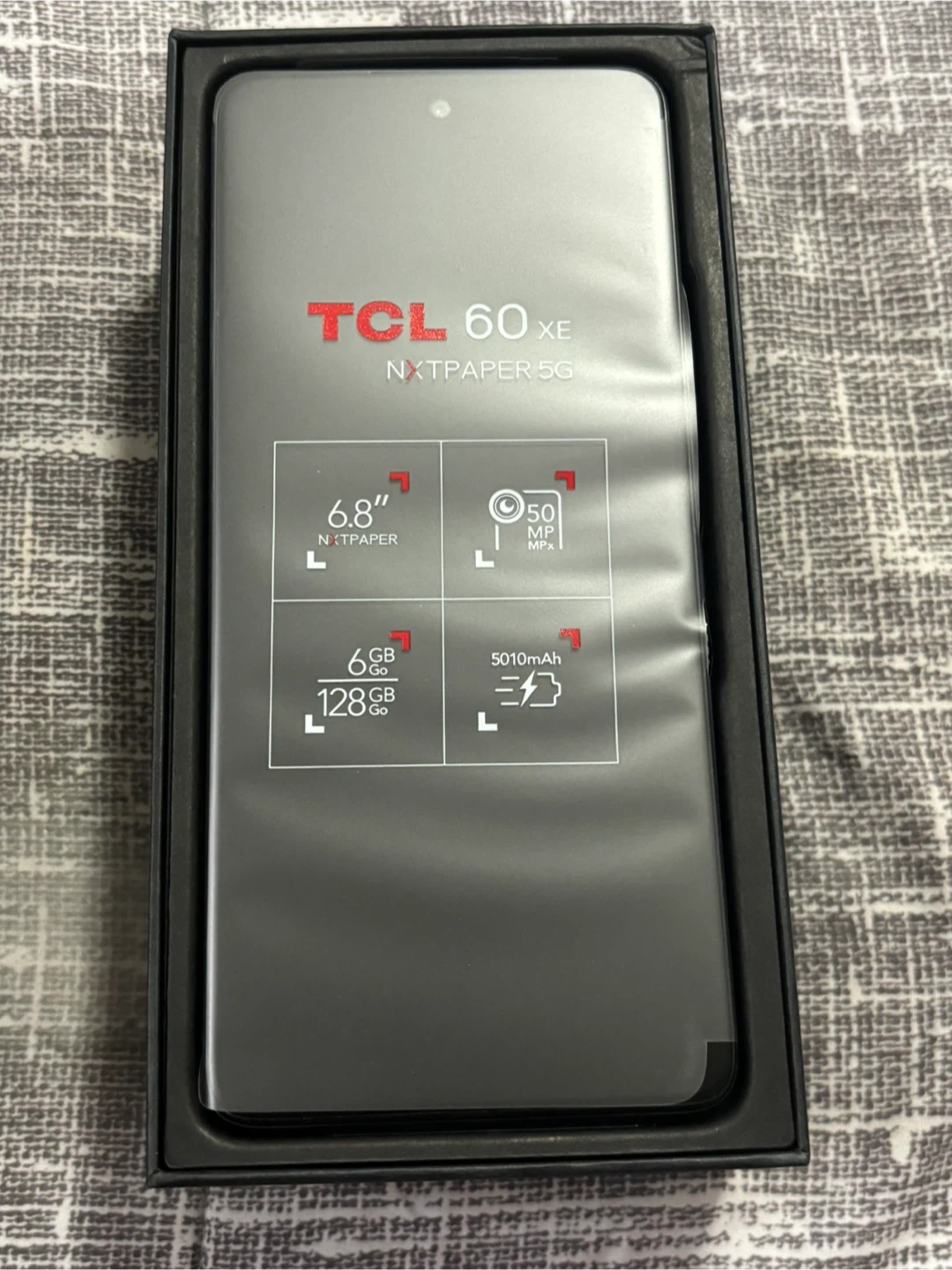 This is a TCL 60 XE NXTpaper 5G smartphone. It features a 6.8" display and a 50MP camera. The phone has 6GB of RAM and 128GB of storage. Includes phone, travel charger, USB-C cable, SIM guide, and safety instructions.