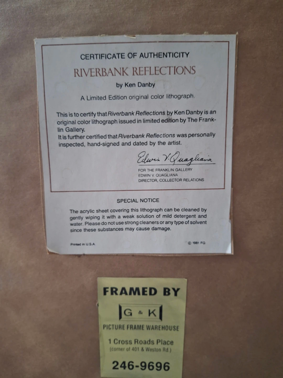 Limited edition original color lithograph titled "Riverbank Reflections" by Ken Danby. Artwork was issued in limited edition by The Franklin Gallery and personally inspected, hand-signed, and dated by the artist. Printed in 1981.