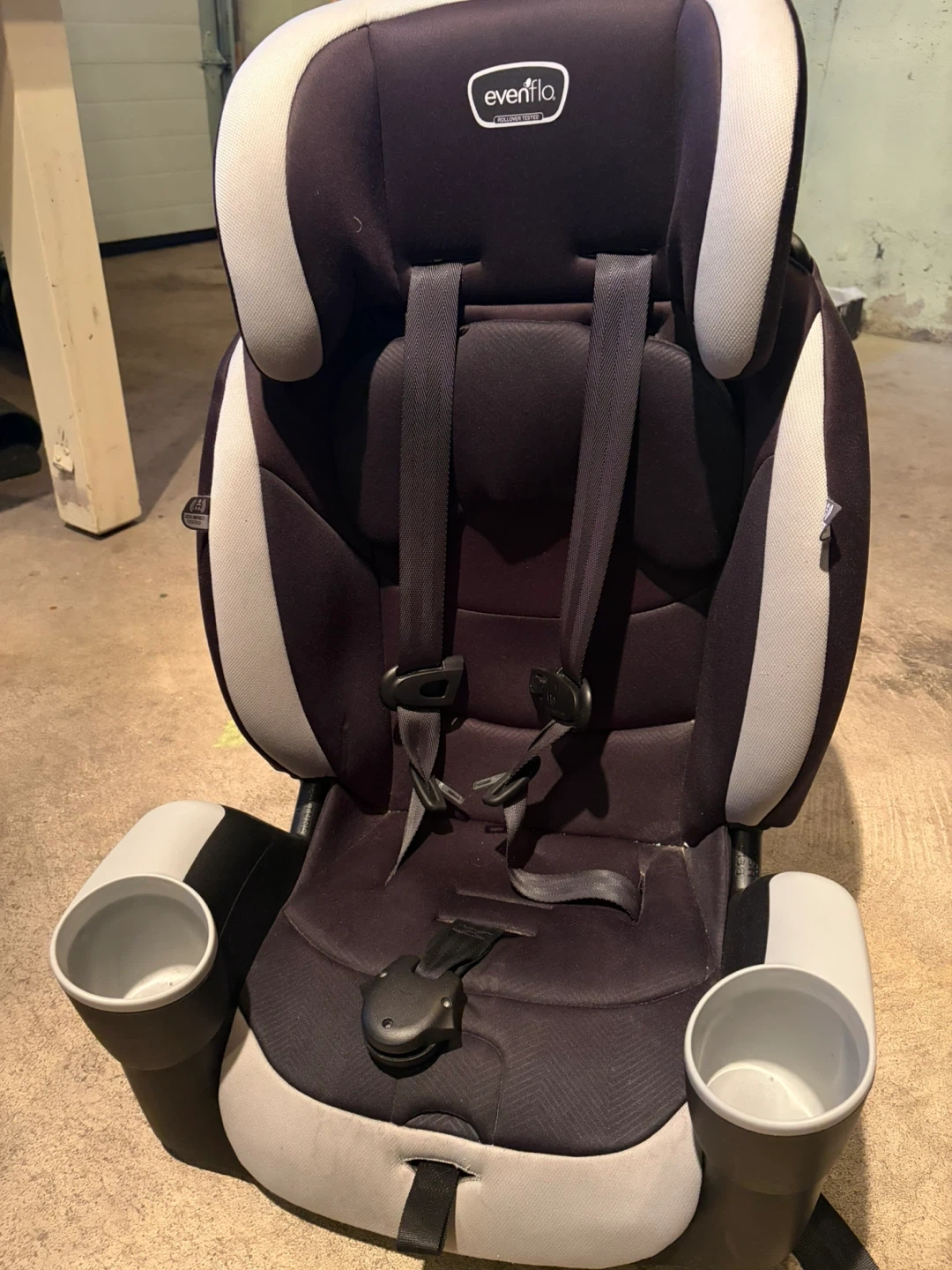 This is an Evenflo child car seat in black and grey. It features a 5-point harness system and two built-in cup holders. It's designed for safety and comfort on the go. Provides secure seating for children during travel.