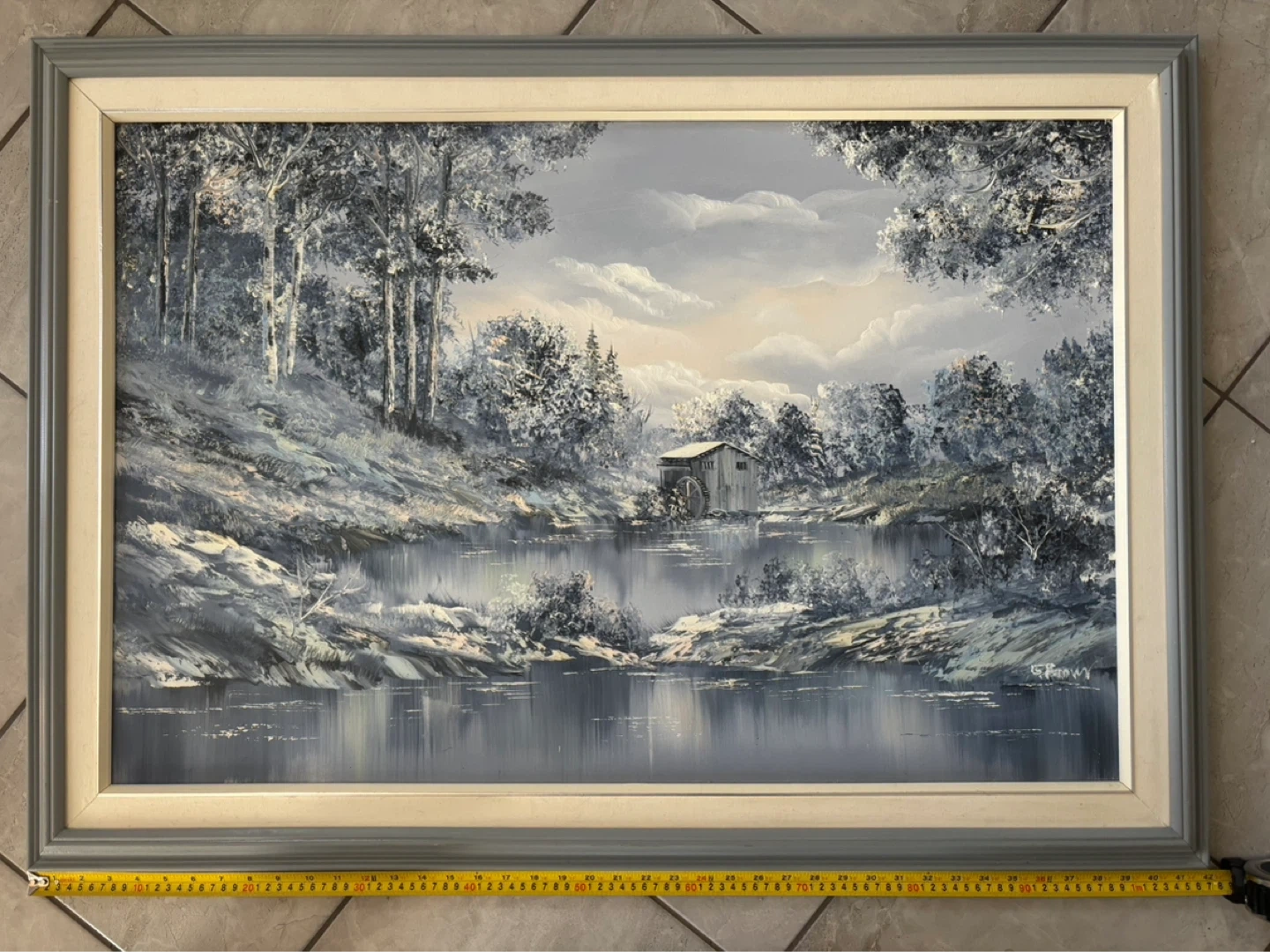 Beautiful vintage oil painting depicting a serene watermill scene by a lake, framed and ready to hang. This piece offers a lovely rustic charm, perfect for adding a touch of nature to any room.