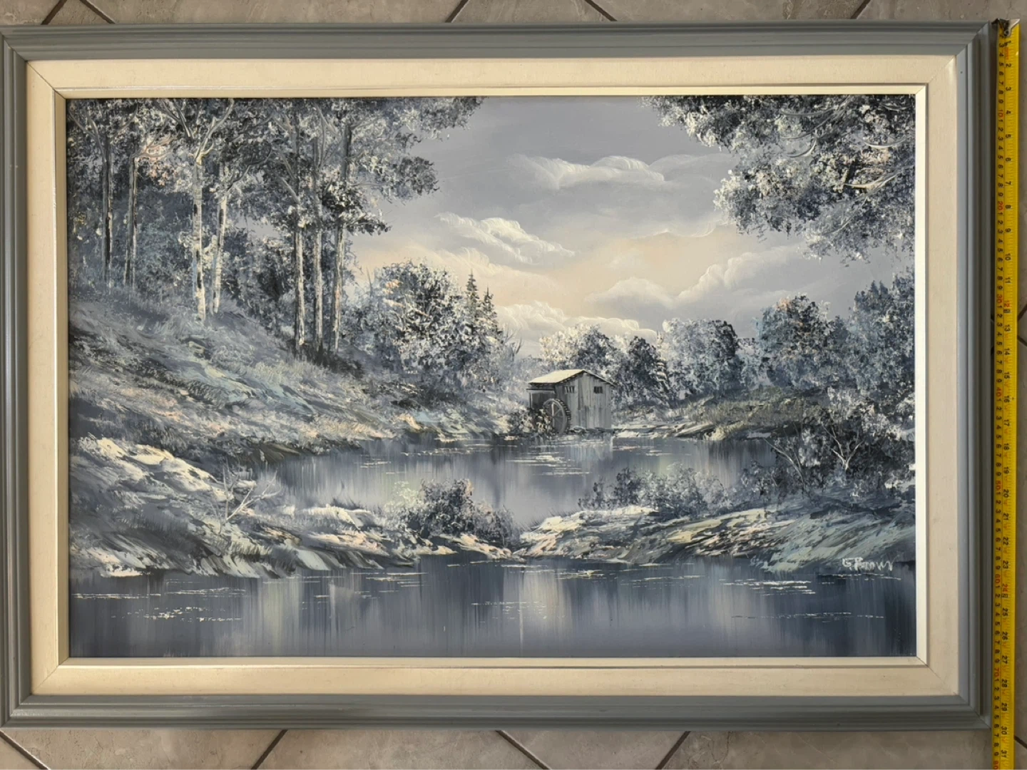 Beautiful vintage oil painting depicting a serene watermill scene by a lake, framed and ready to hang. This piece offers a lovely rustic charm, perfect for adding a touch of nature to any room.