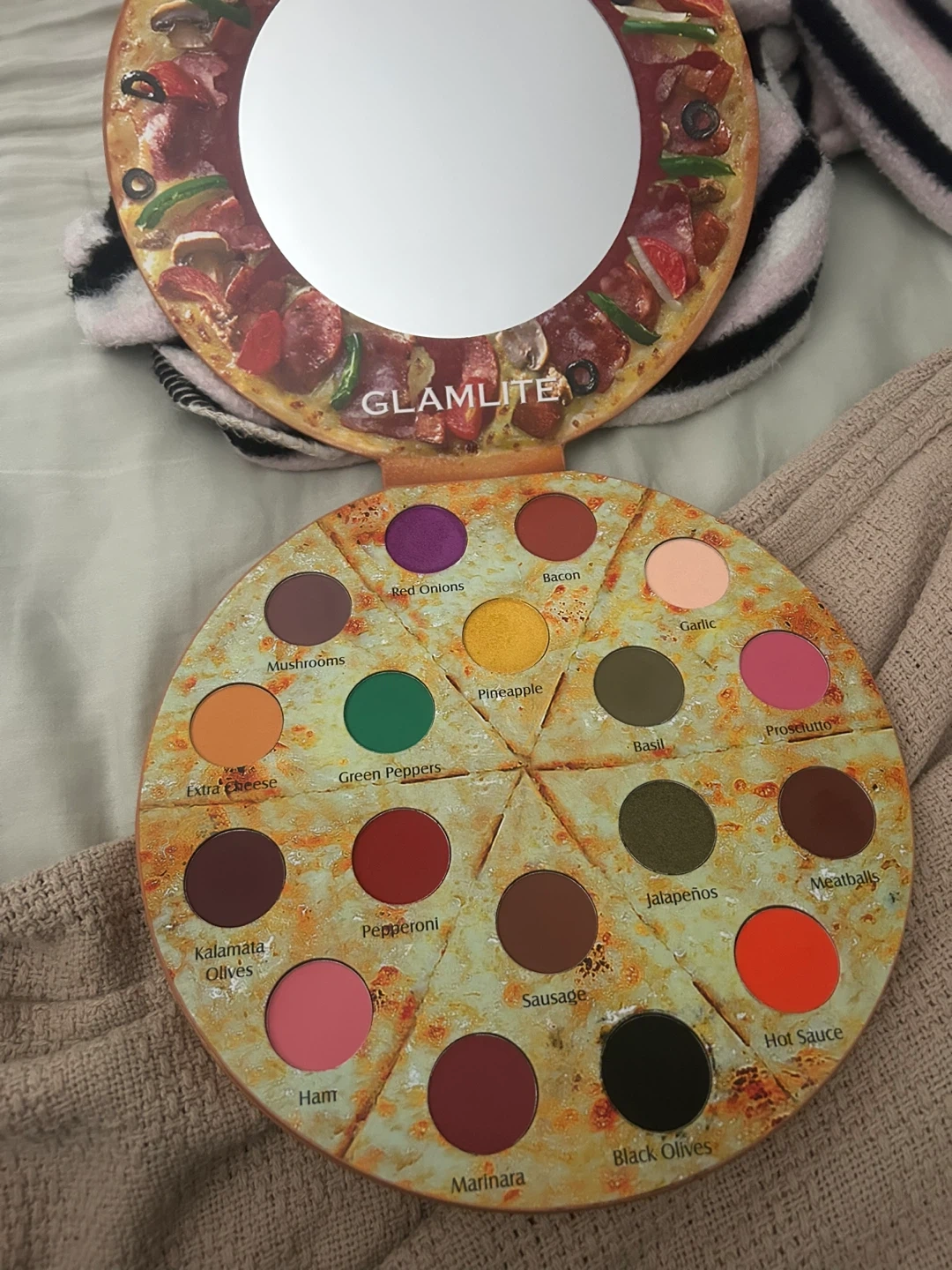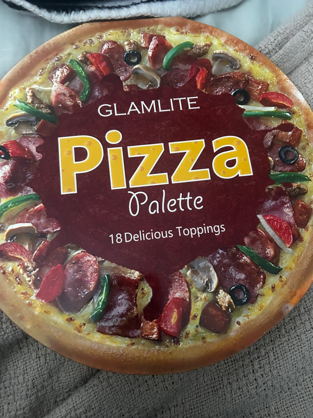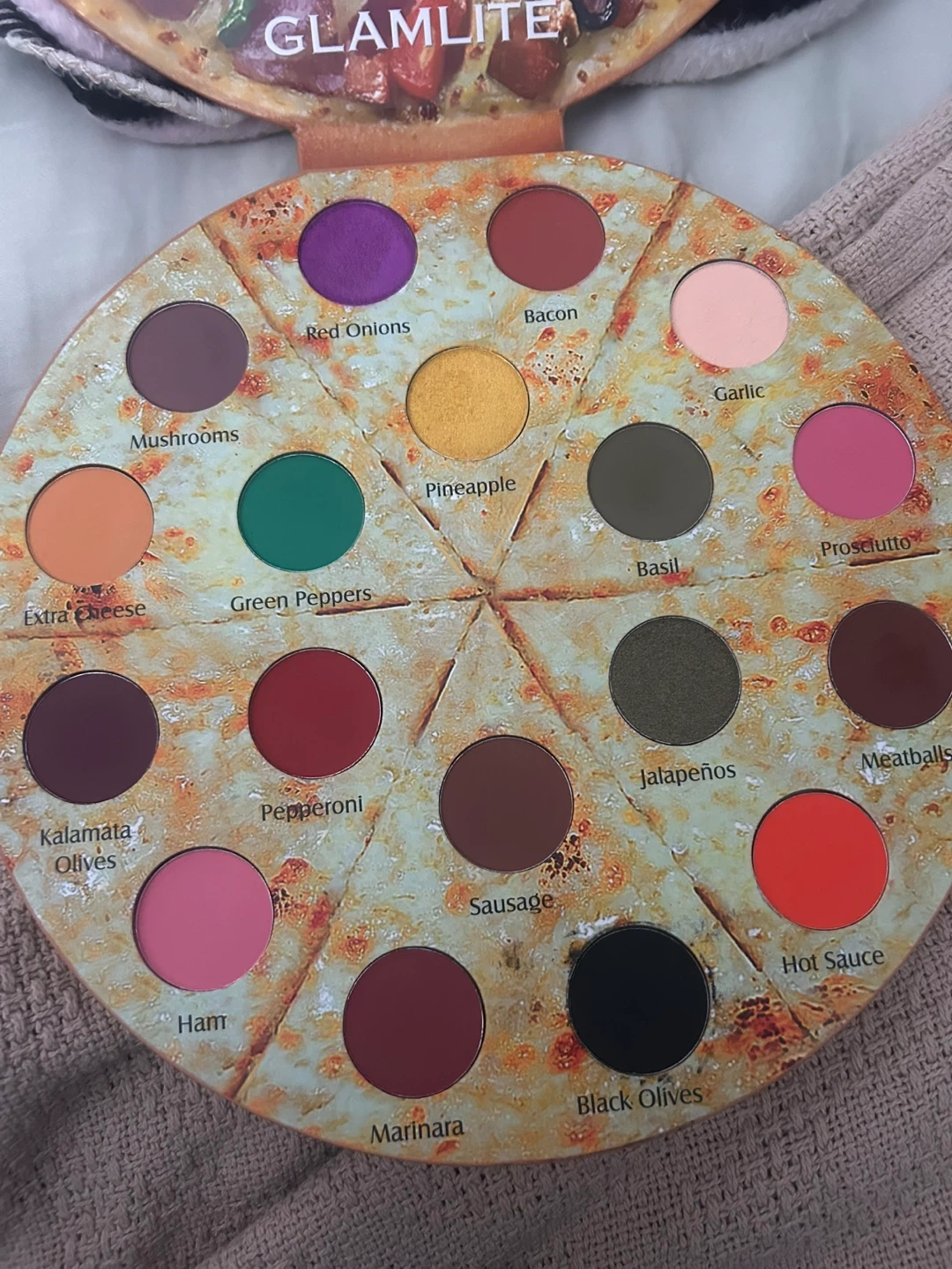 Glamlite's Pizza Palette features 18 'delicious topping' shades inspired by pizza ingredients. It includes a mirror and comes in a unique pizza-shaped compact.