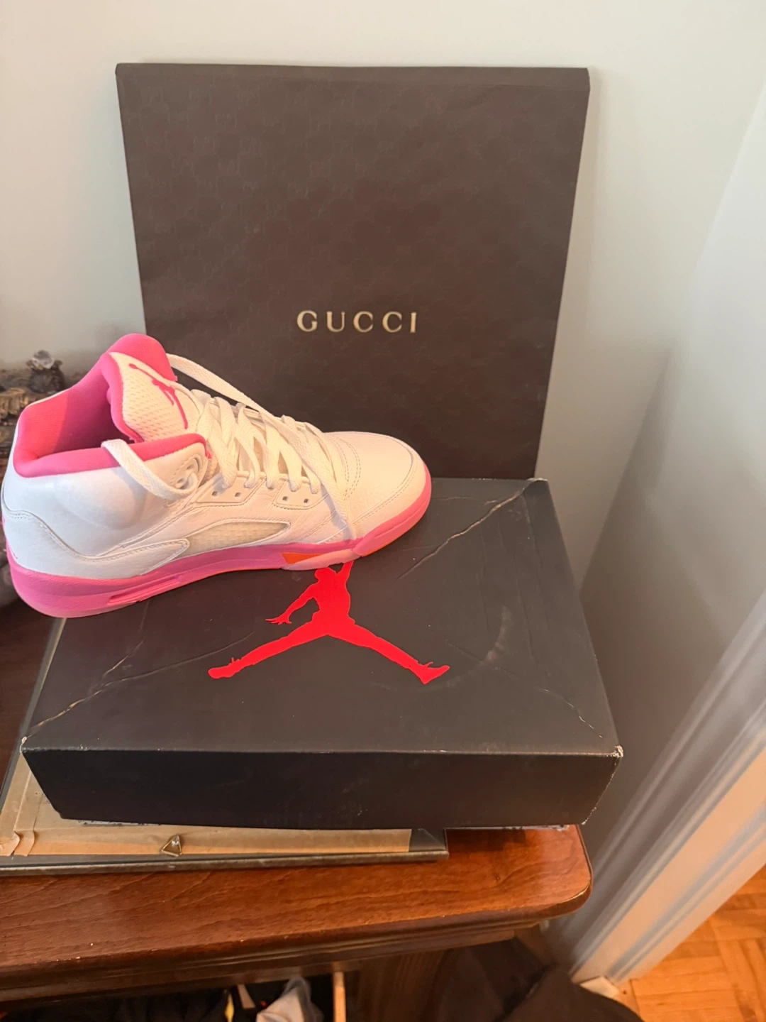 White and pink Air Jordan 5 Retro SE sneakers. Includes original Jordan brand box and a Gucci box.
