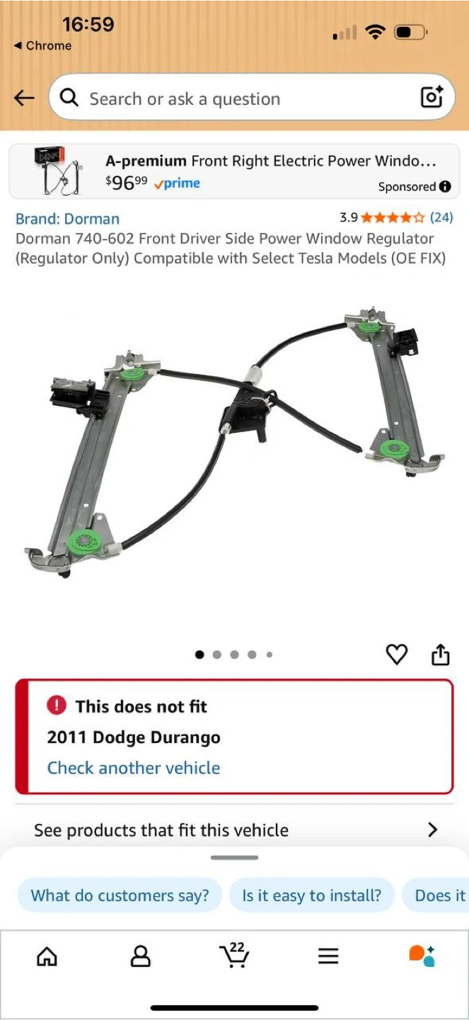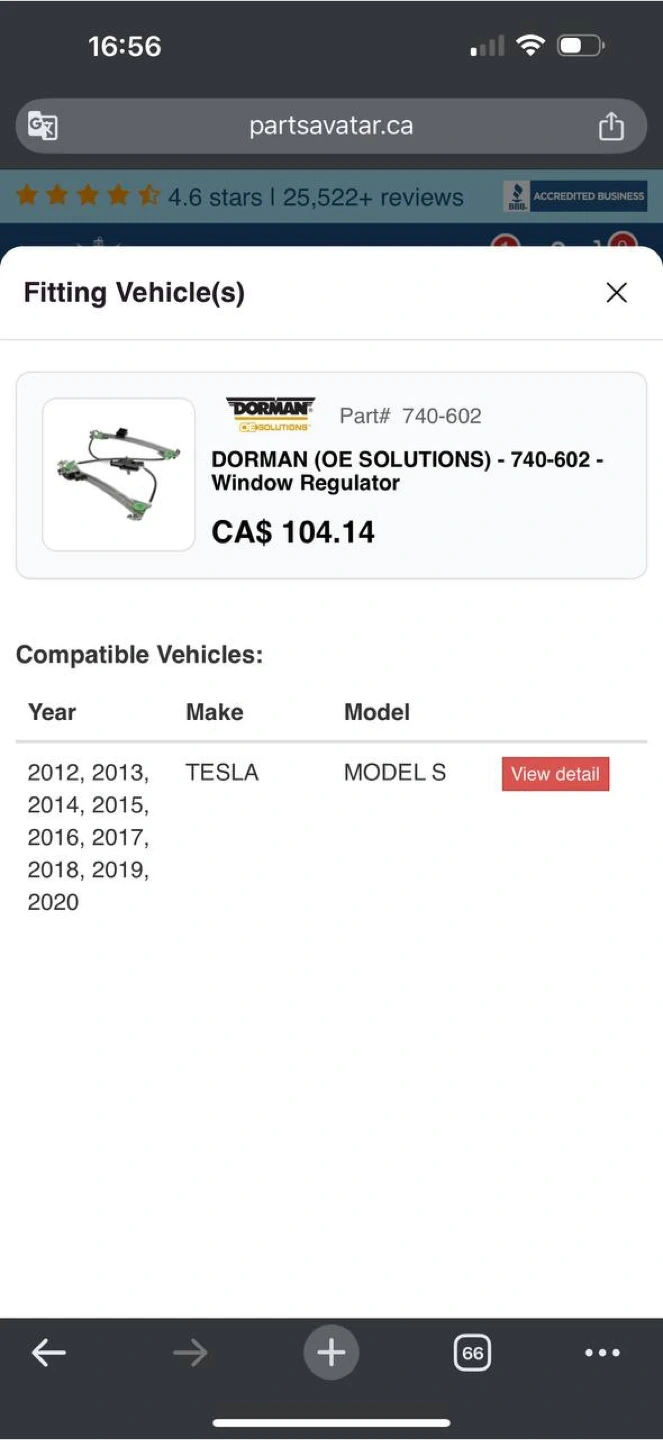 🚗 Dorman 740-602 Front Driver Side Window Regulator (Tesla Model S 2012–2020) – NEW OPEN BOX