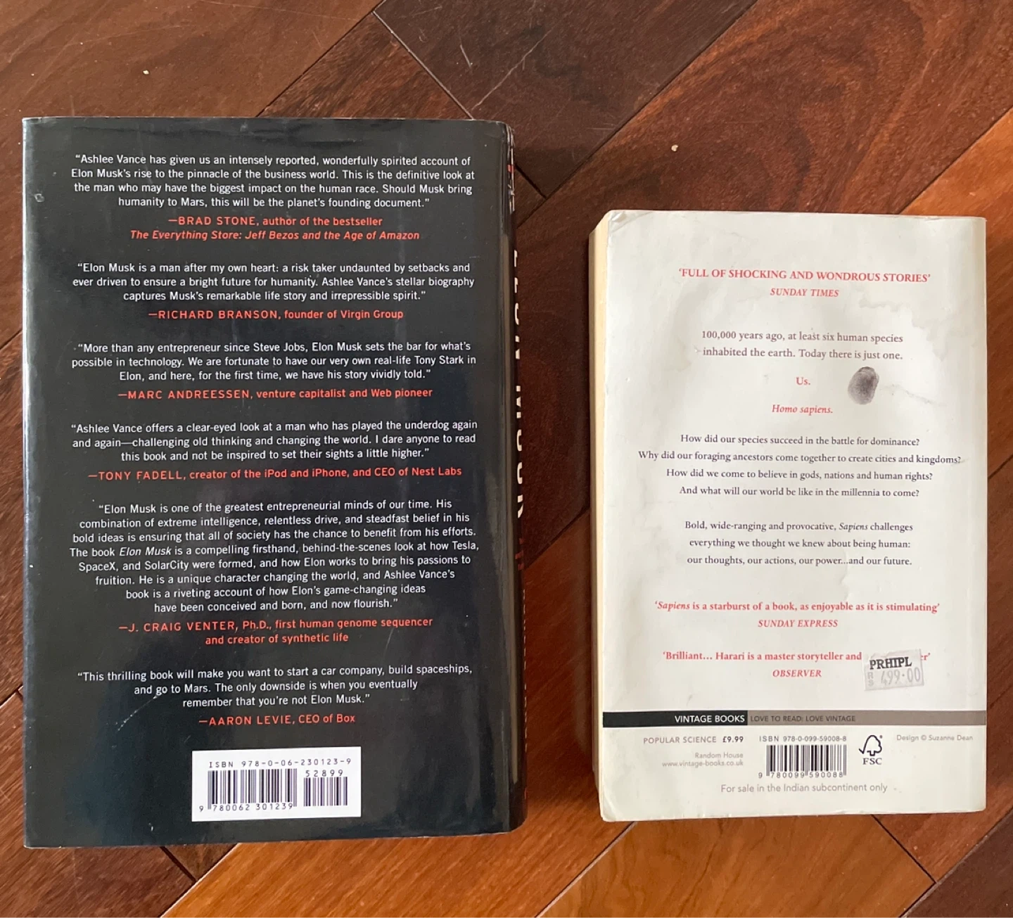 Two books: 'Elon Musk: Tesla, SpaceX, and the Quest for a Fantastic Future' by Ashlee Vance (Hard Cover). Also 'Sapiens: A Brief History of Humankind' by Yuval Noah Hariri (paperback).