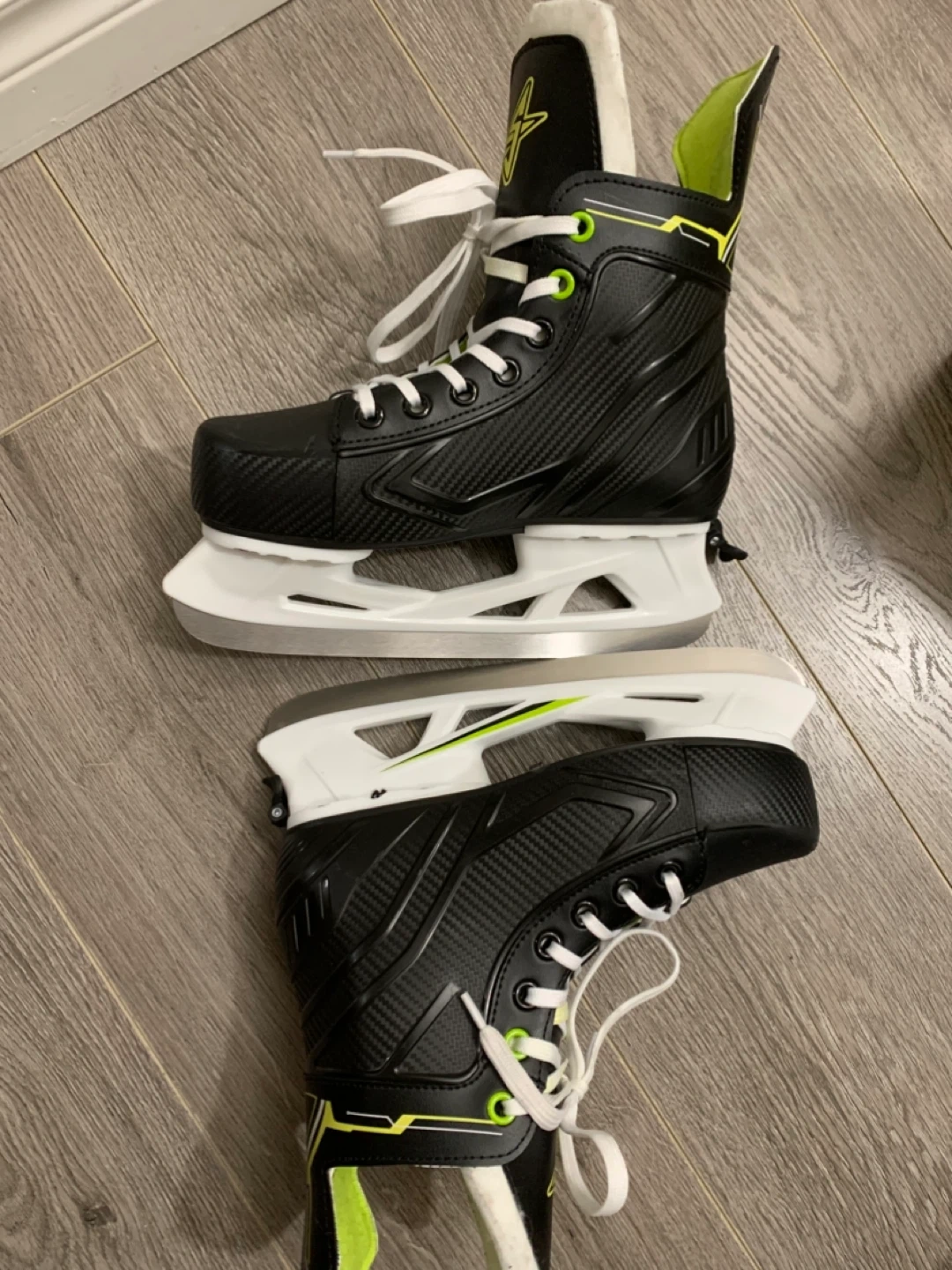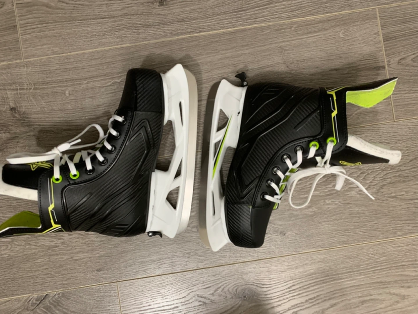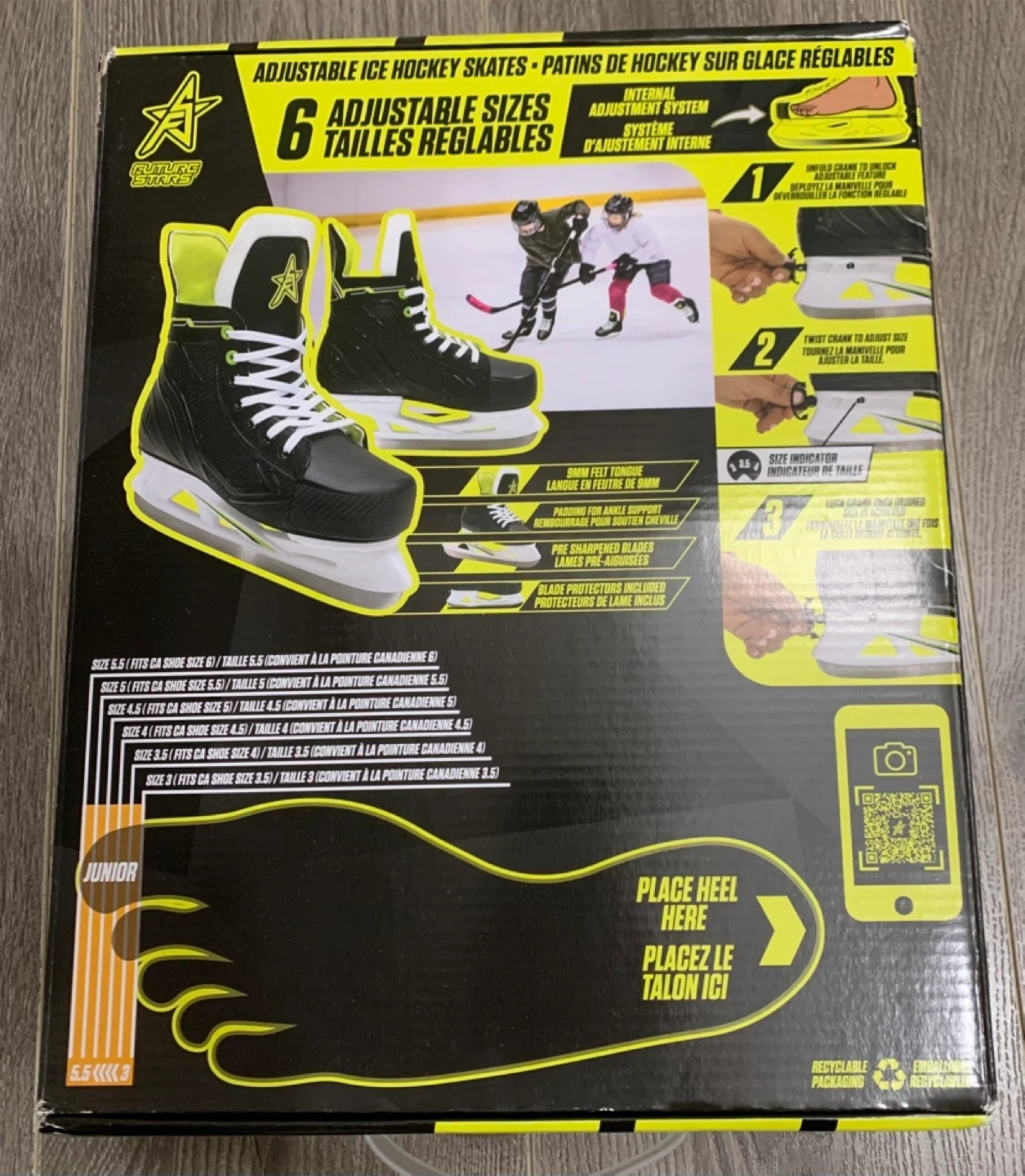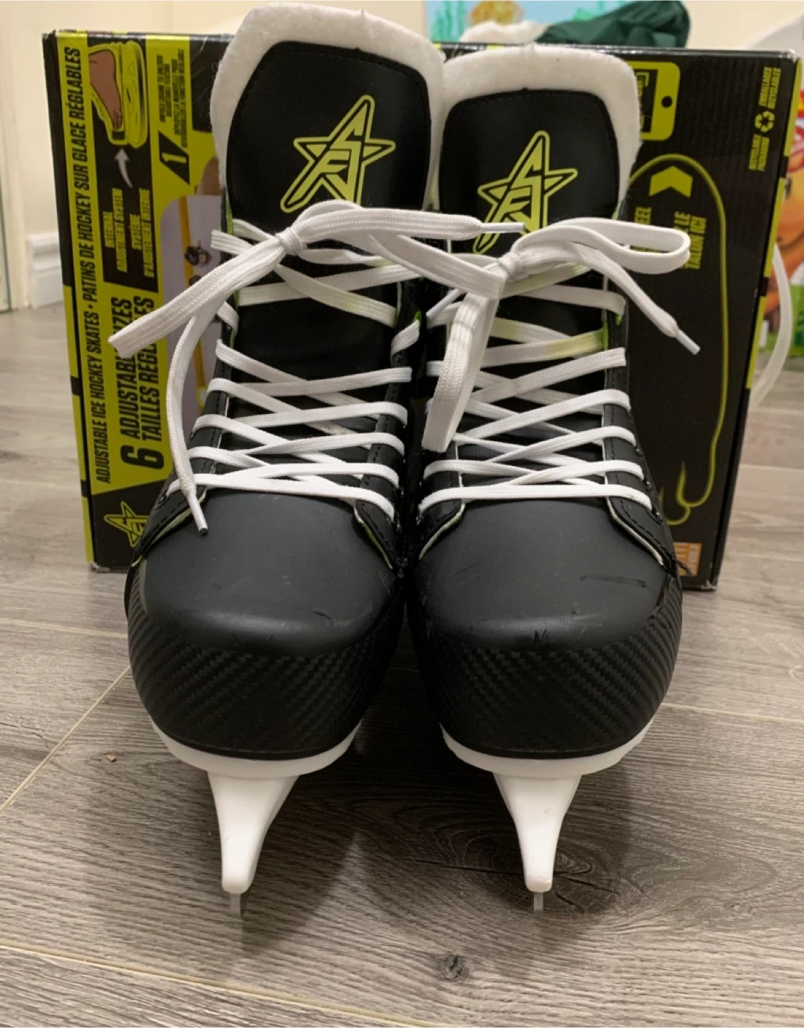 These junior hockey skates are adjustable for 6 sizes, fitting junior sizes 5.5 to 3.5 (US Youth sizes 6 to 4.5). They feature a reinforced boot for ankle support and pre-sharpened blades. Blade protectors are included.