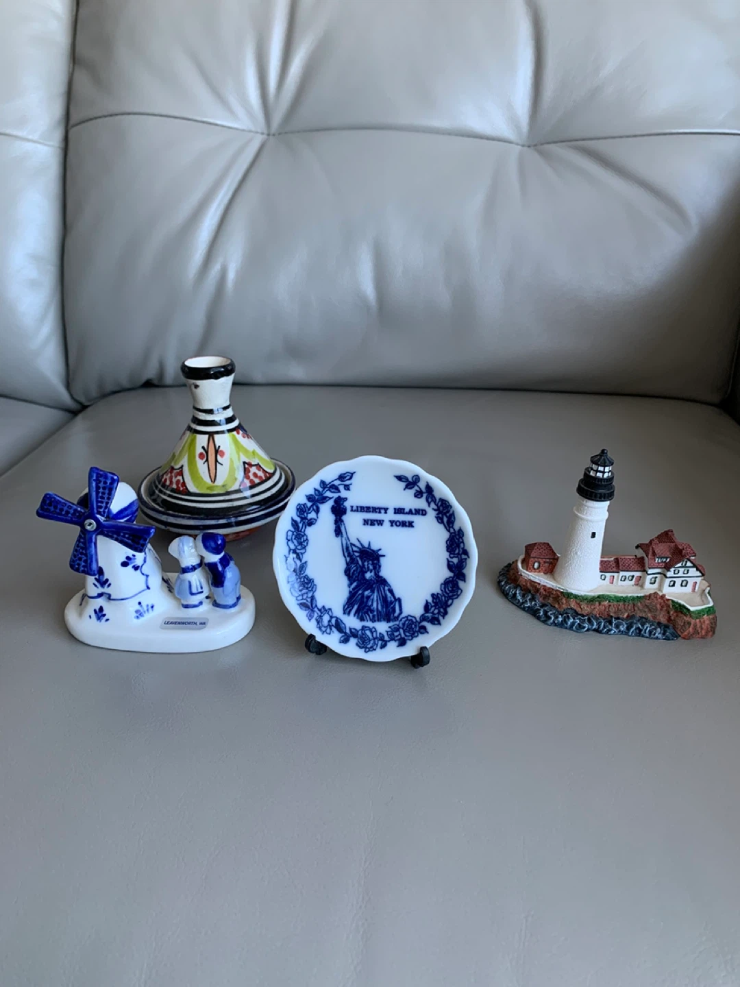 “ Gand Made, Glazed Ceramic Tiles, collection of decorative items, including a Statue if Liberty Island, New York plate, a Windmill figurine, and a Lighthouse figurine from Royal Delft Museum Factory in Holland, Blue / White, Tajin Cooking Pot from Morocco.