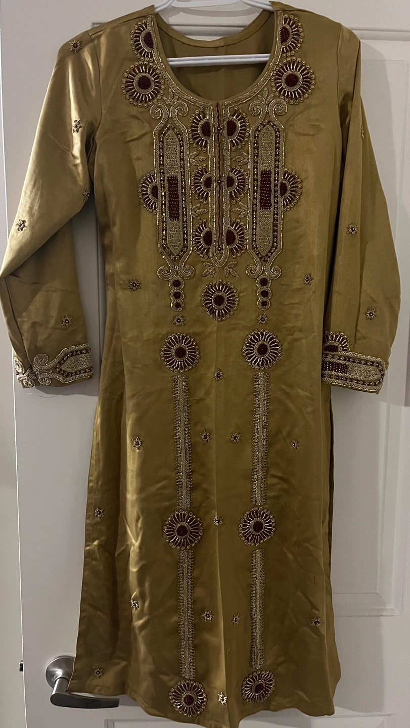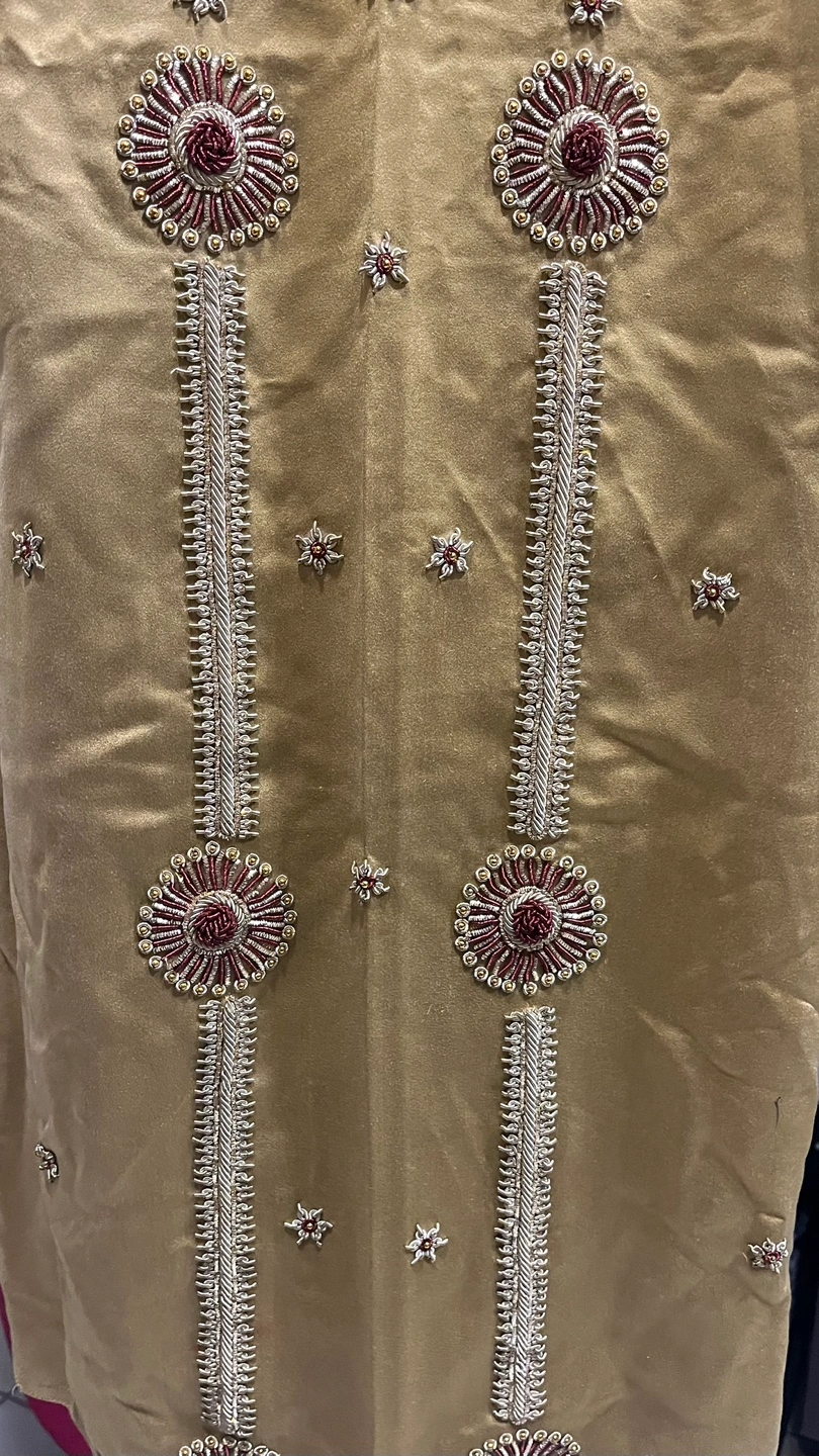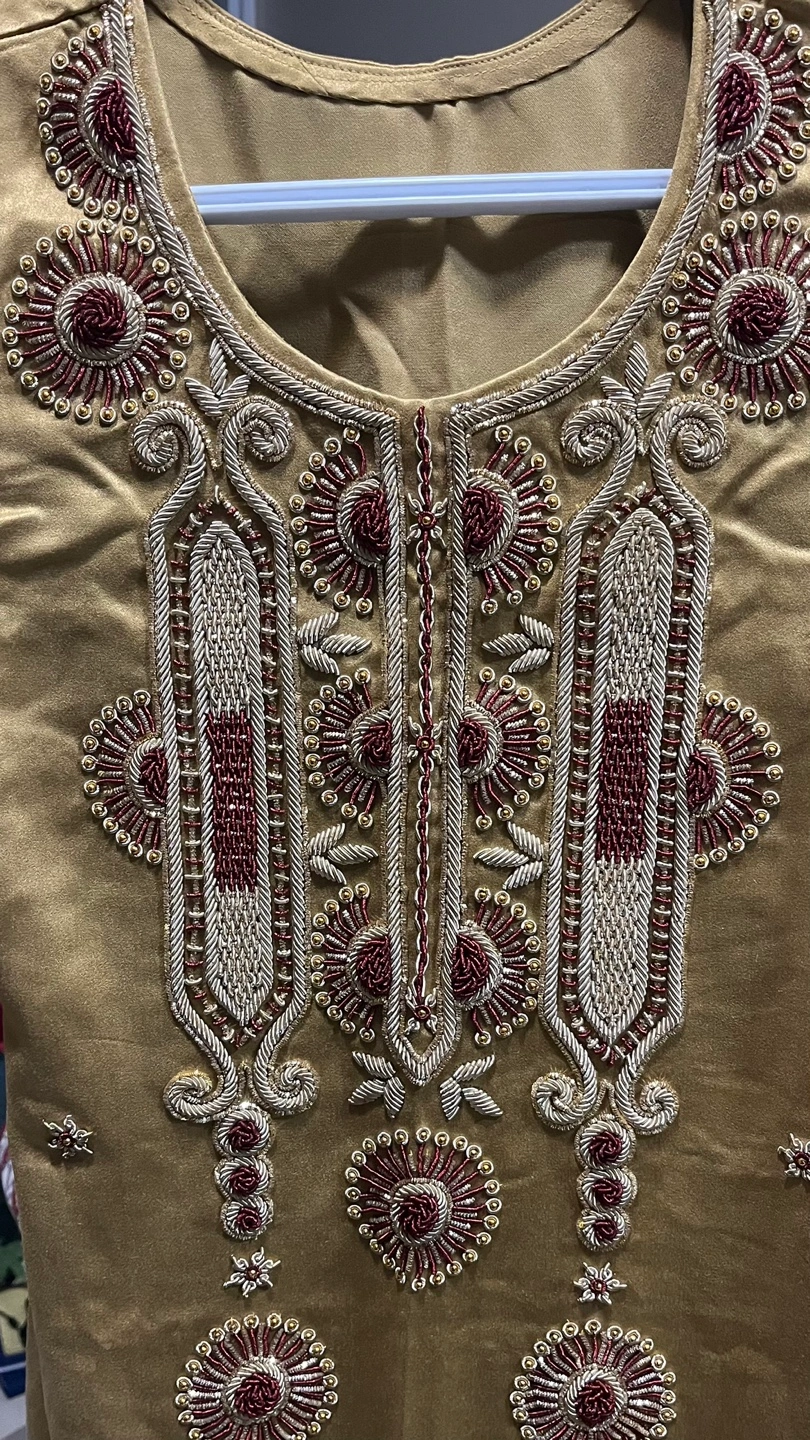 Beautiful gold velvet suit with maroon embroidery and embellishments. Three-quarter sleeves. 3 piece Suit new