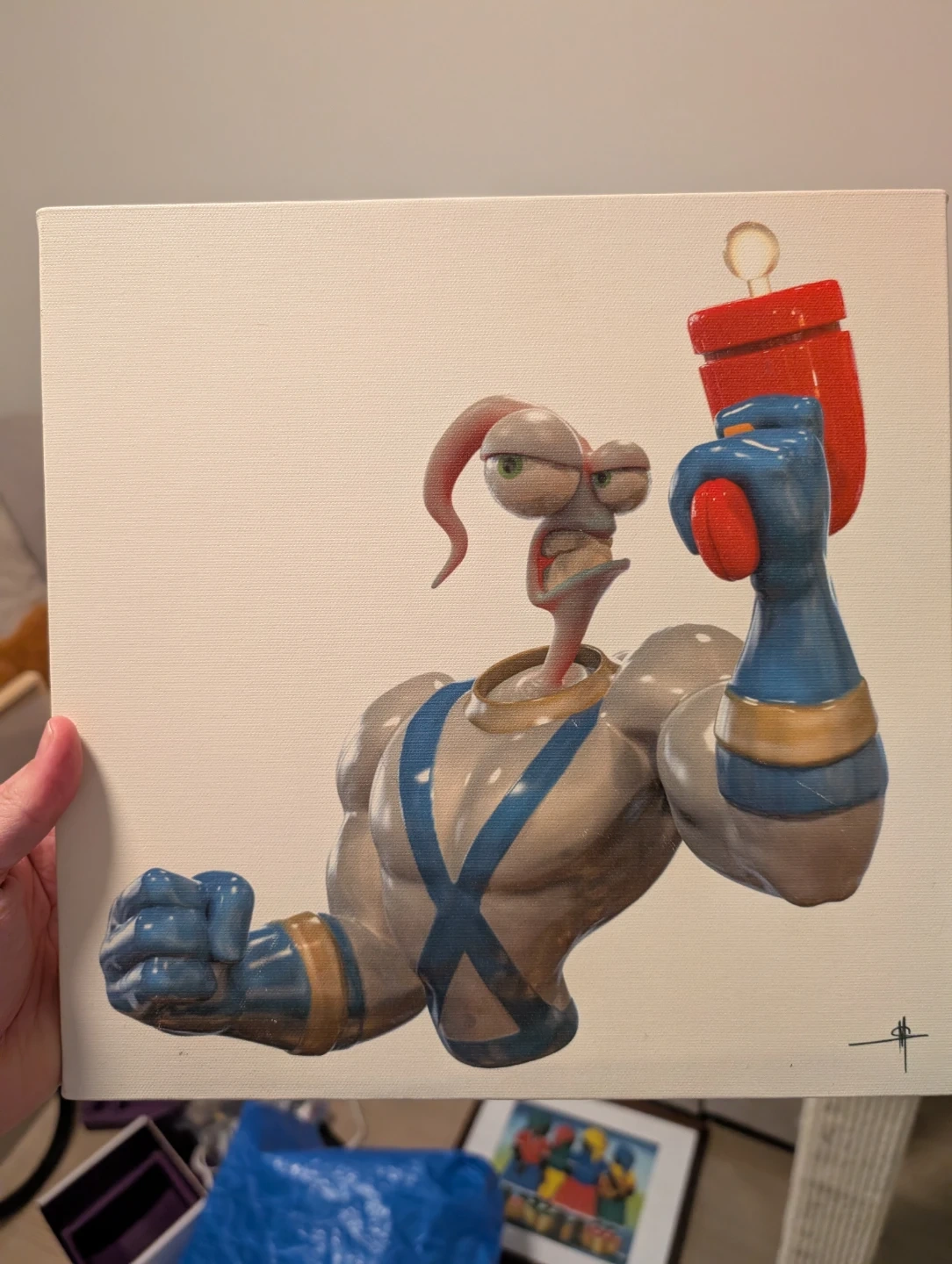 Canvas art featuring Earthworm Jim. This piece is ready to hang. Great for any fan of the classic video game character!