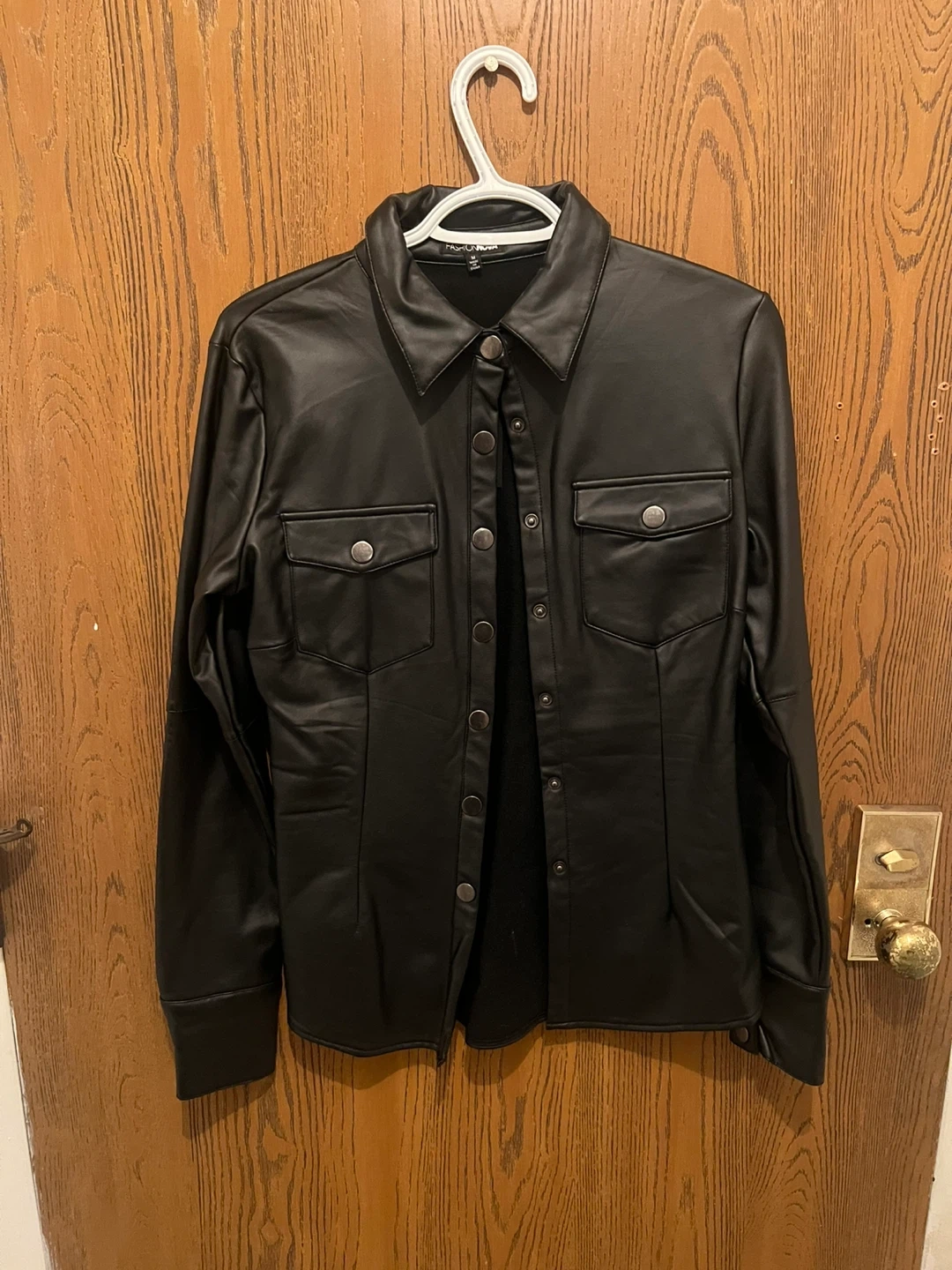 Black faux leather button-up shirt from Fashion Nova. It has two front pockets and a collared neckline. Material is faux leather.