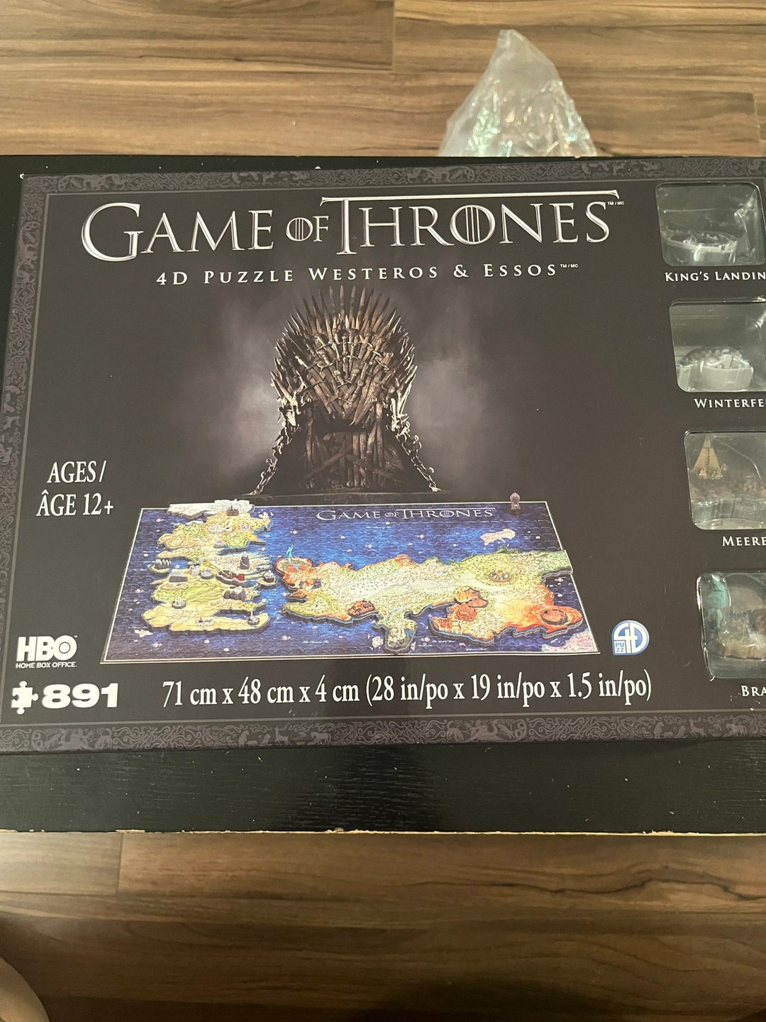 This is a 4D puzzle of Westeros and Essos from the Game of Thrones TV show. It comes with a map puzzle and 3D models of King's Landing, Winterfell, Meereen, and Braavos. The puzzle is for ages 12 and up. It is 71 cm x 48 cm x 4 cm (28 in/pox 19 in/pox 1.5 in/po).