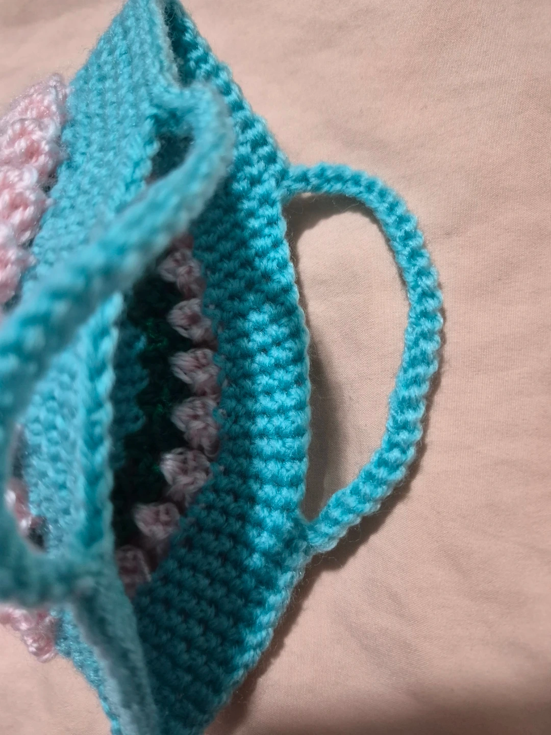 This is a cute, handmade crochet bag in a lovely teal colour. It's decorated with a row of small pink flowers and green leaves. Perfect for carrying small items or as a decorative piece!
