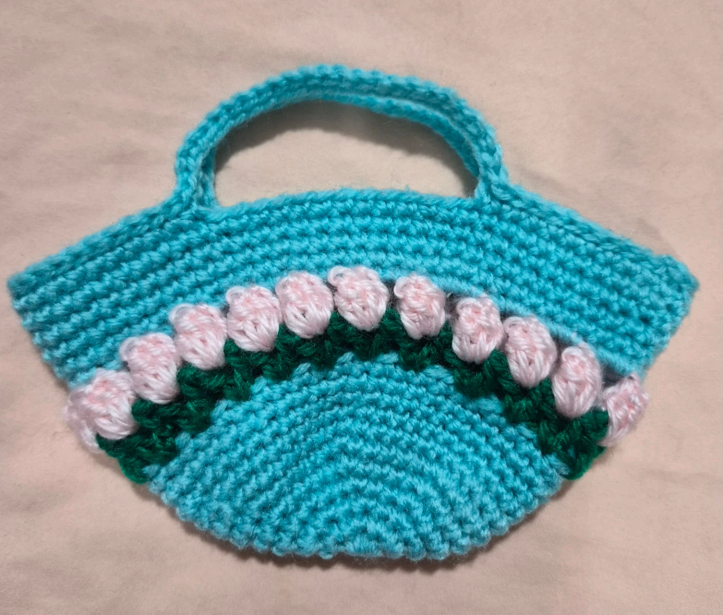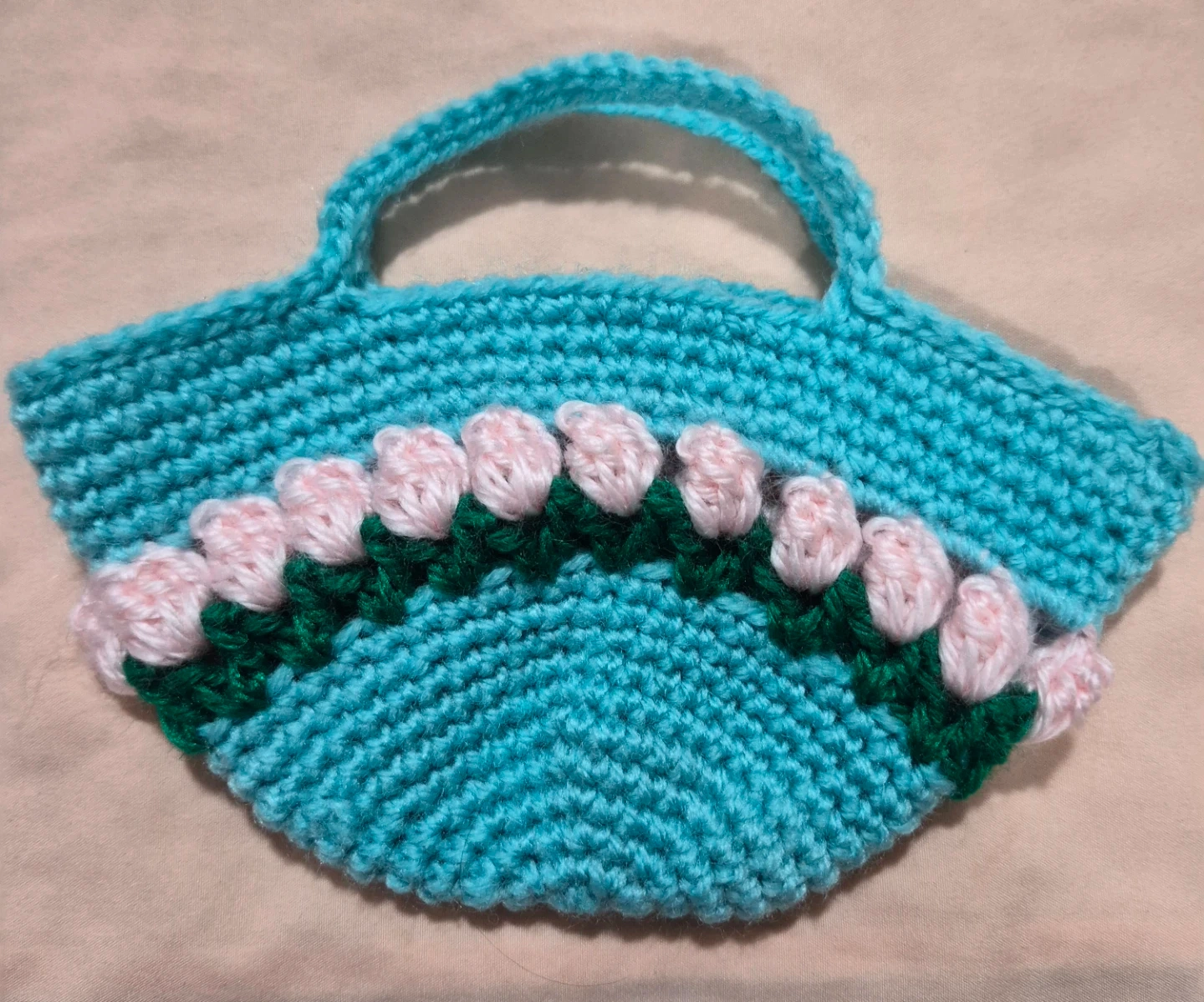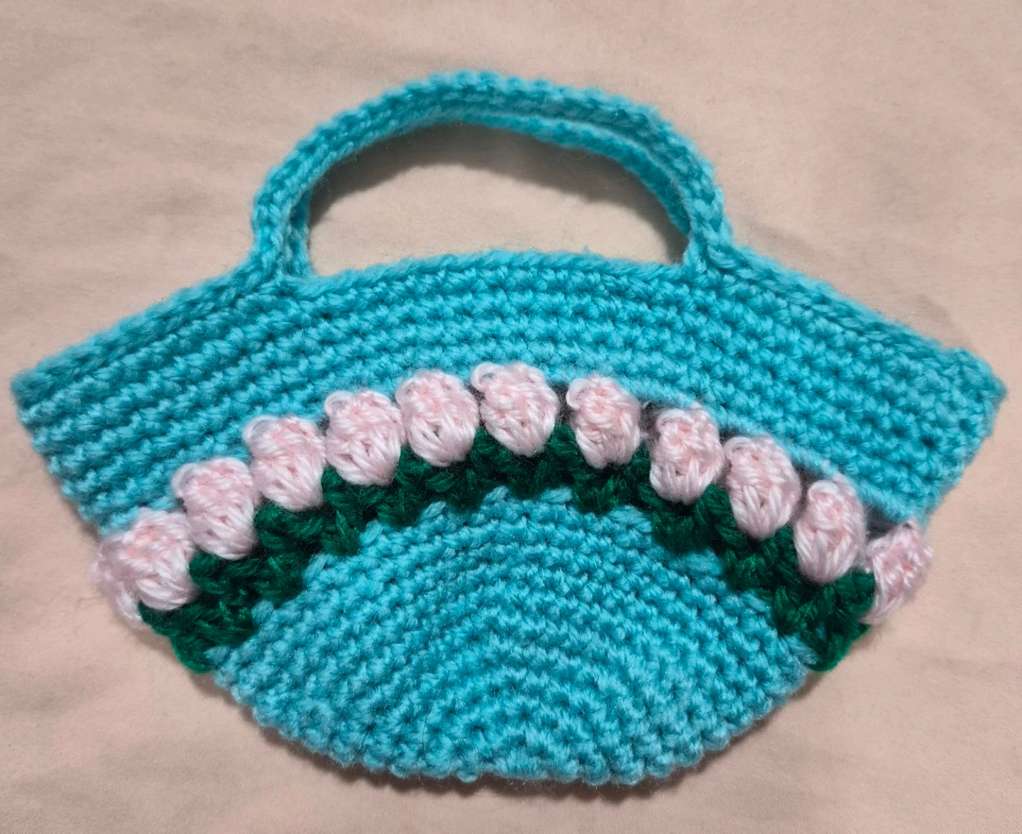This is a cute, handmade crochet bag in a lovely teal colour. It's decorated with a row of small pink flowers and green leaves. Perfect for carrying small items or as a decorative piece!