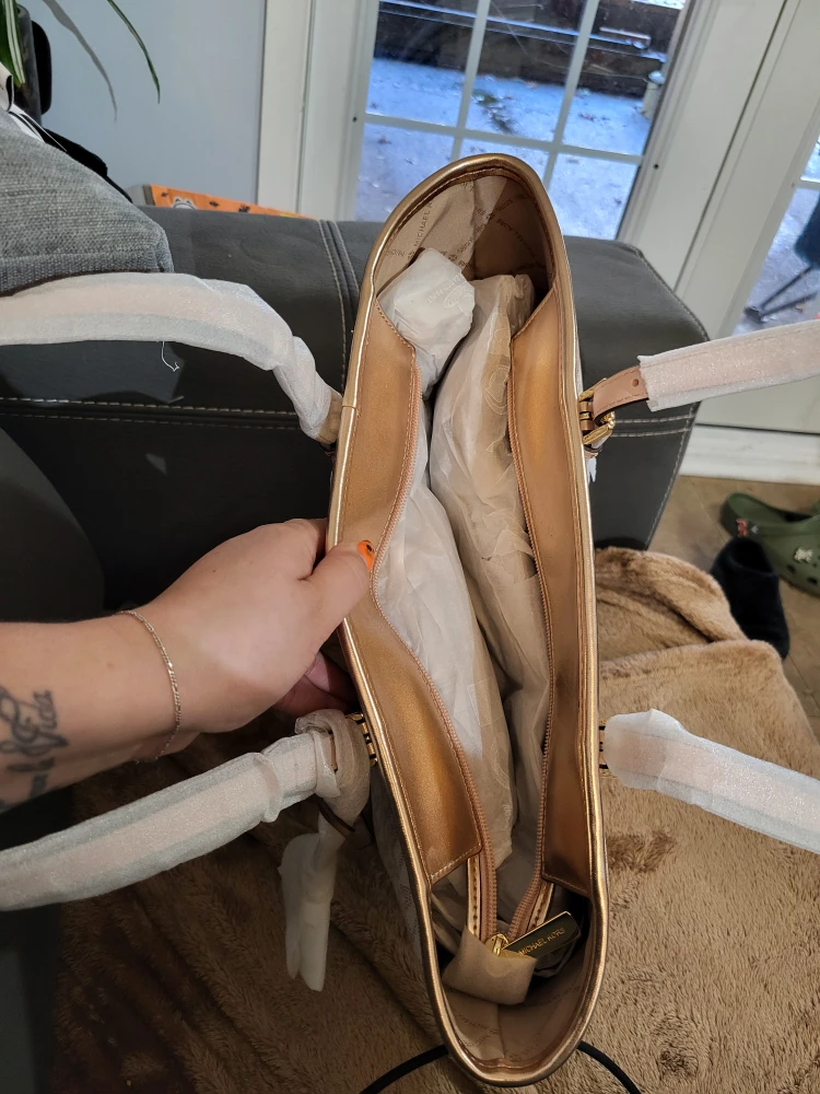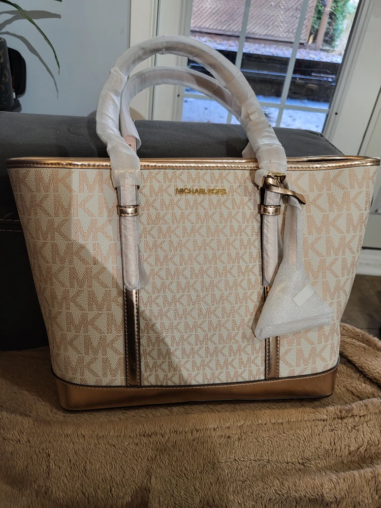 This is a brand new Michael Kors Rose gold tote bag! It has a beautiful design and is perfect for everyday use. The bag has a spacious interior and is made with high-quality materials.