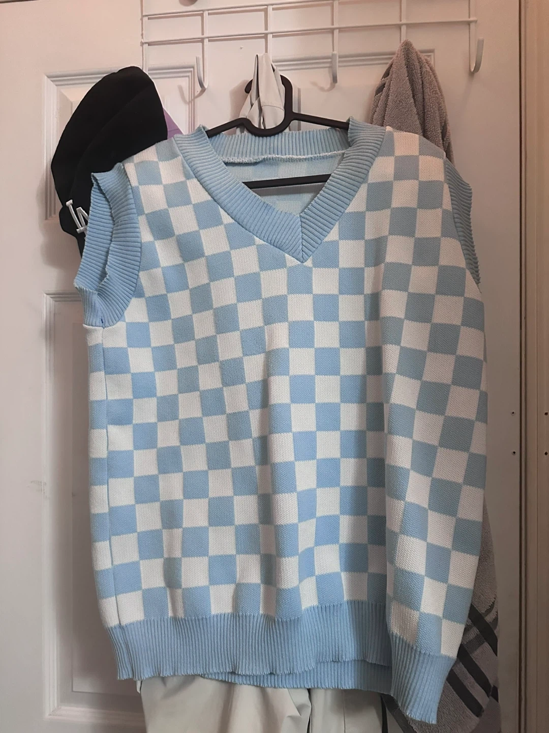 This sleeveless sweater vest features a classic checkerboard pattern in light blue and white. It's knitted with a soft material and has a V-neckline. Perfect for layering over shirts or dresses for a stylish look.
