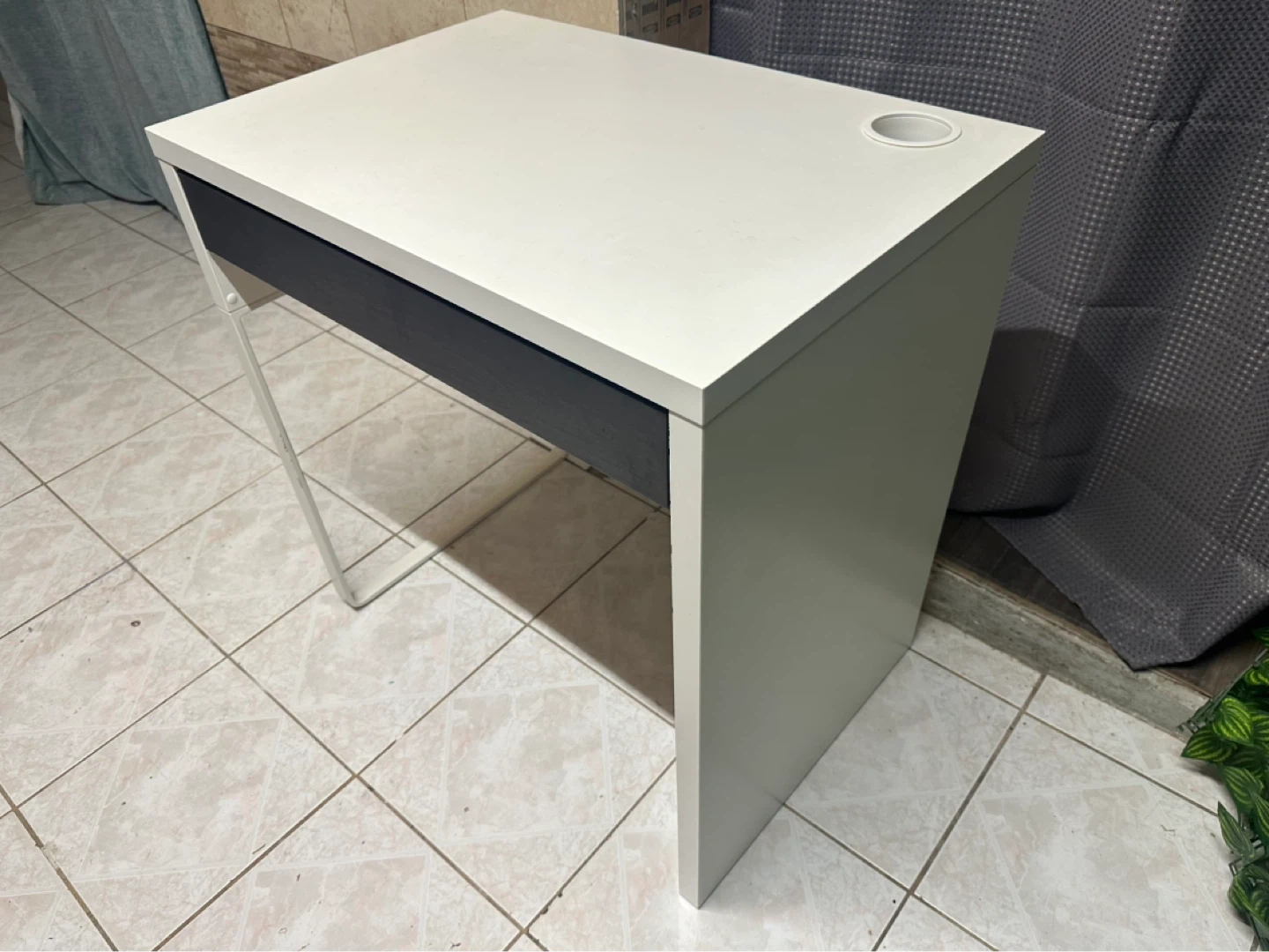 This modern white desk features a sturdy build, clean lines, and a smooth tabletop with a built‑in cable management hole.
