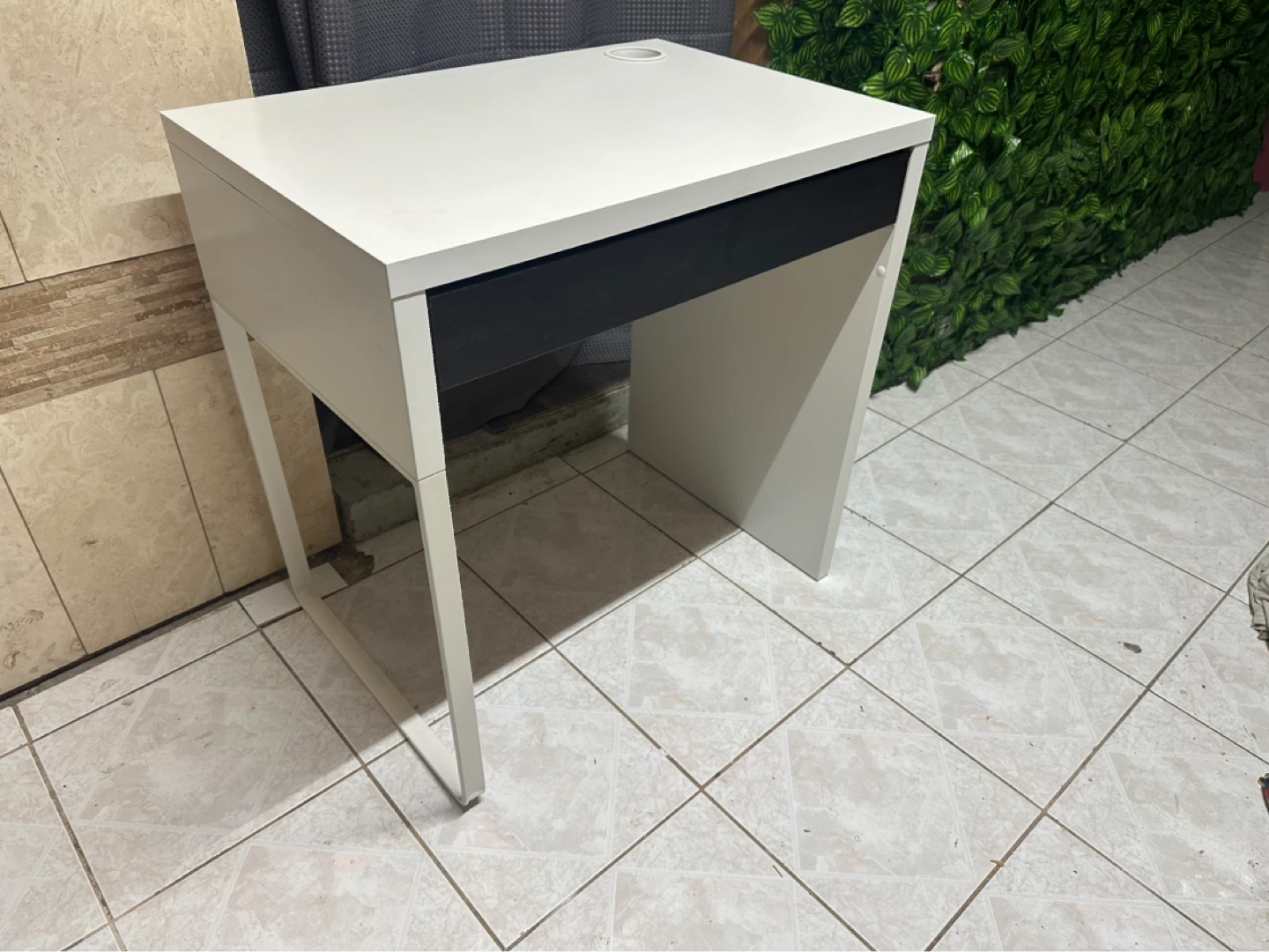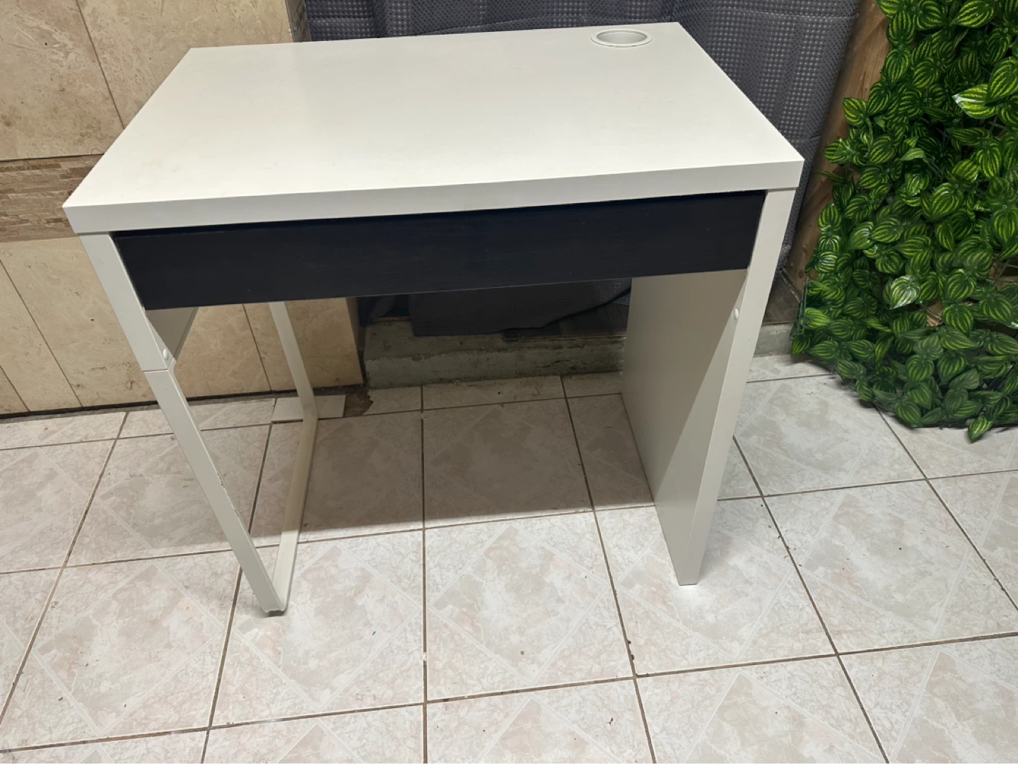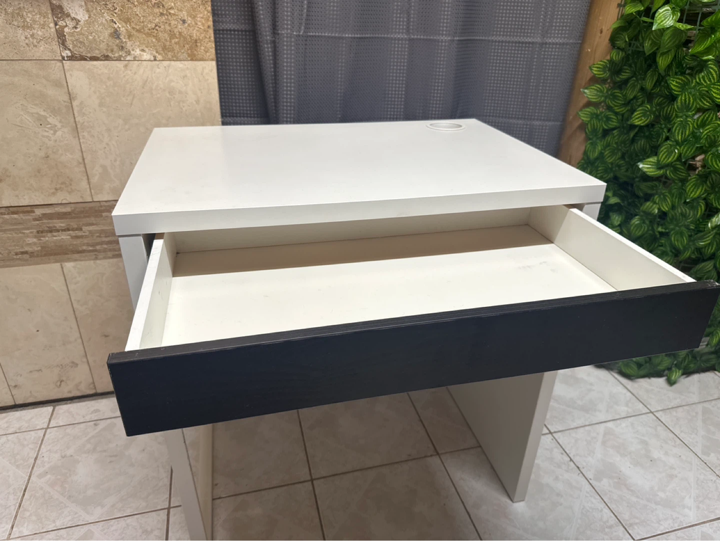 This modern white desk features a sturdy build, clean lines, and a smooth tabletop with a built‑in cable management hole.