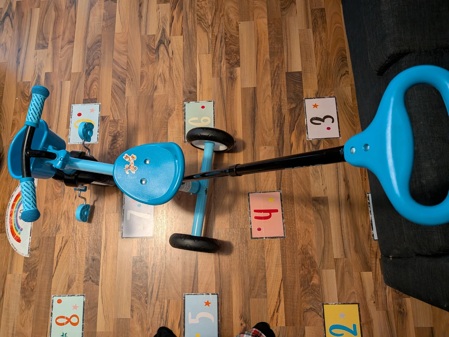This bright blue toddler tricycle features a parent push handle for guidance. It has comfortable grip handles and a seat for your little one. A fun way for kids to explore outdoors!
