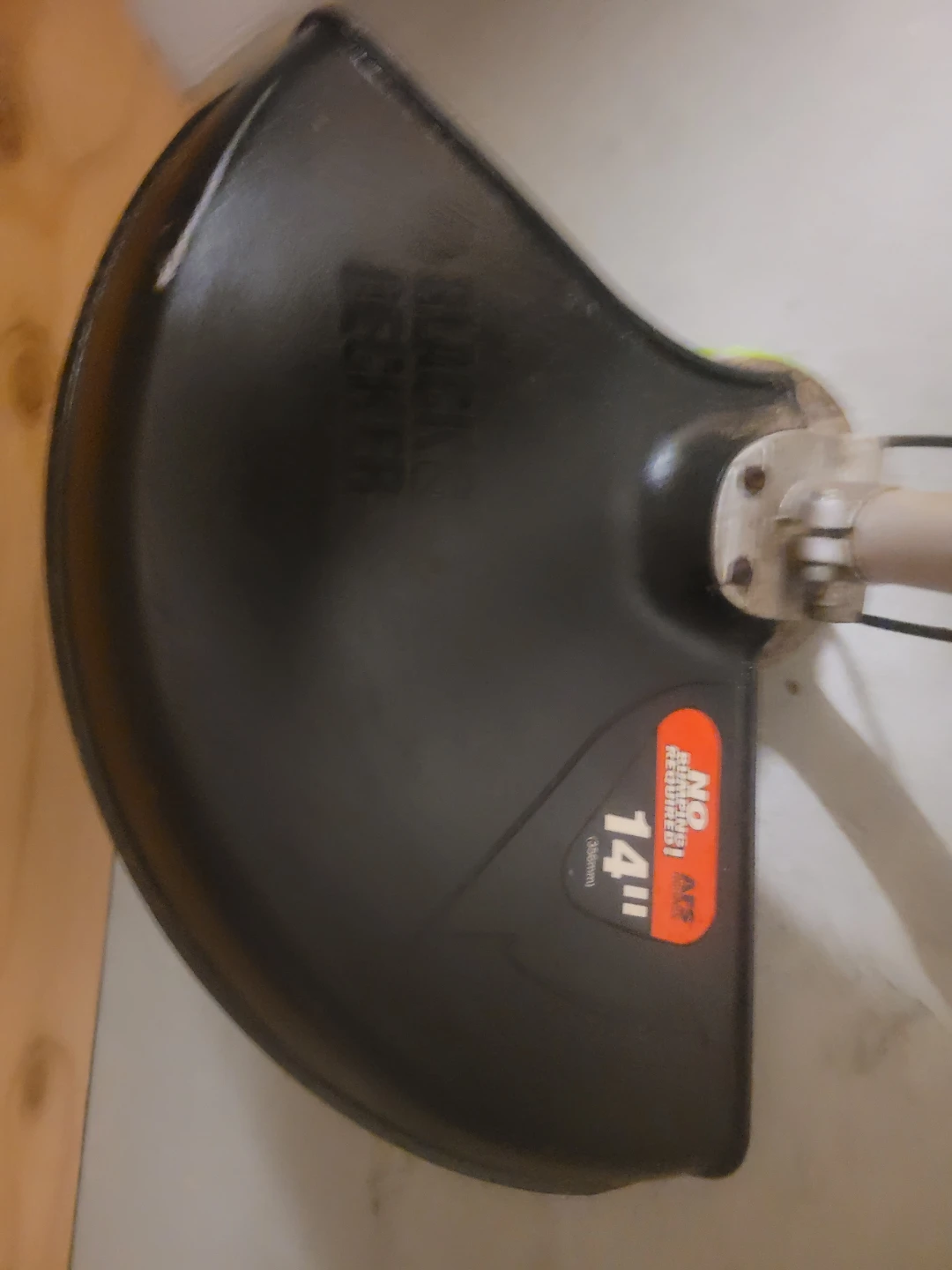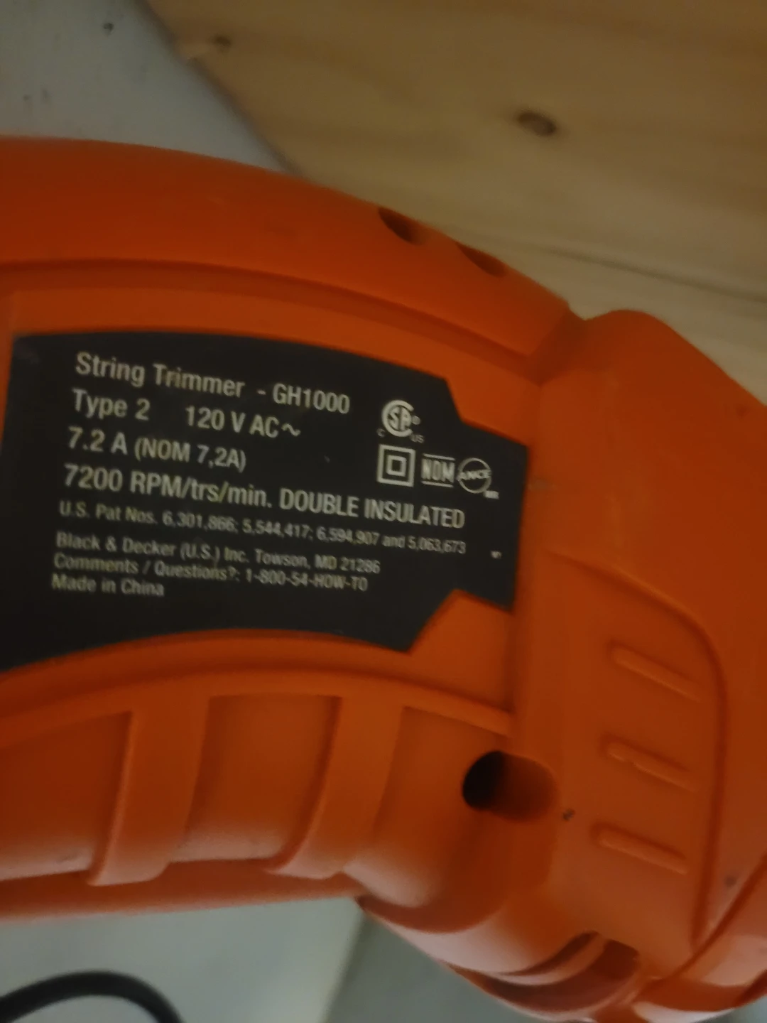 This is a Black & Decker GH1000 string trimmer. It operates at 120 V AC and has a dual-spiral cutting head. The trimmer spins at 7200 RPM and features double insulation for safety. It's ideal for tidying up edges around your yard.