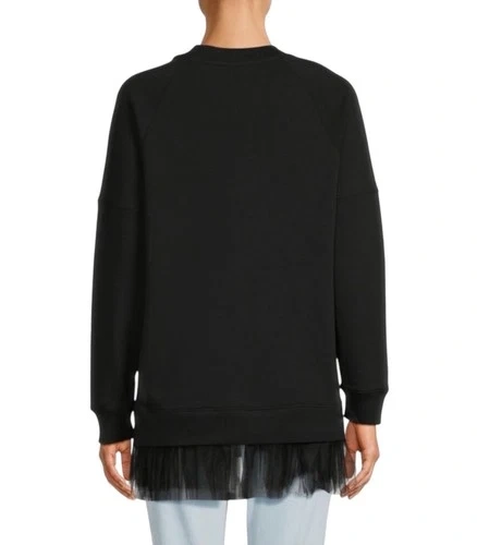 Iconic Moschino Couture black sweatshirt featuring the signature teddy bear cake graphic at the chest. Designed with a playful sheer tulle underlay that peeks out at the hem, giving this piece a sweatshirt-meets-dress silhouette. Can be worn on its own as a mini dress or layered over leggings or tights for a chic streetwear look.